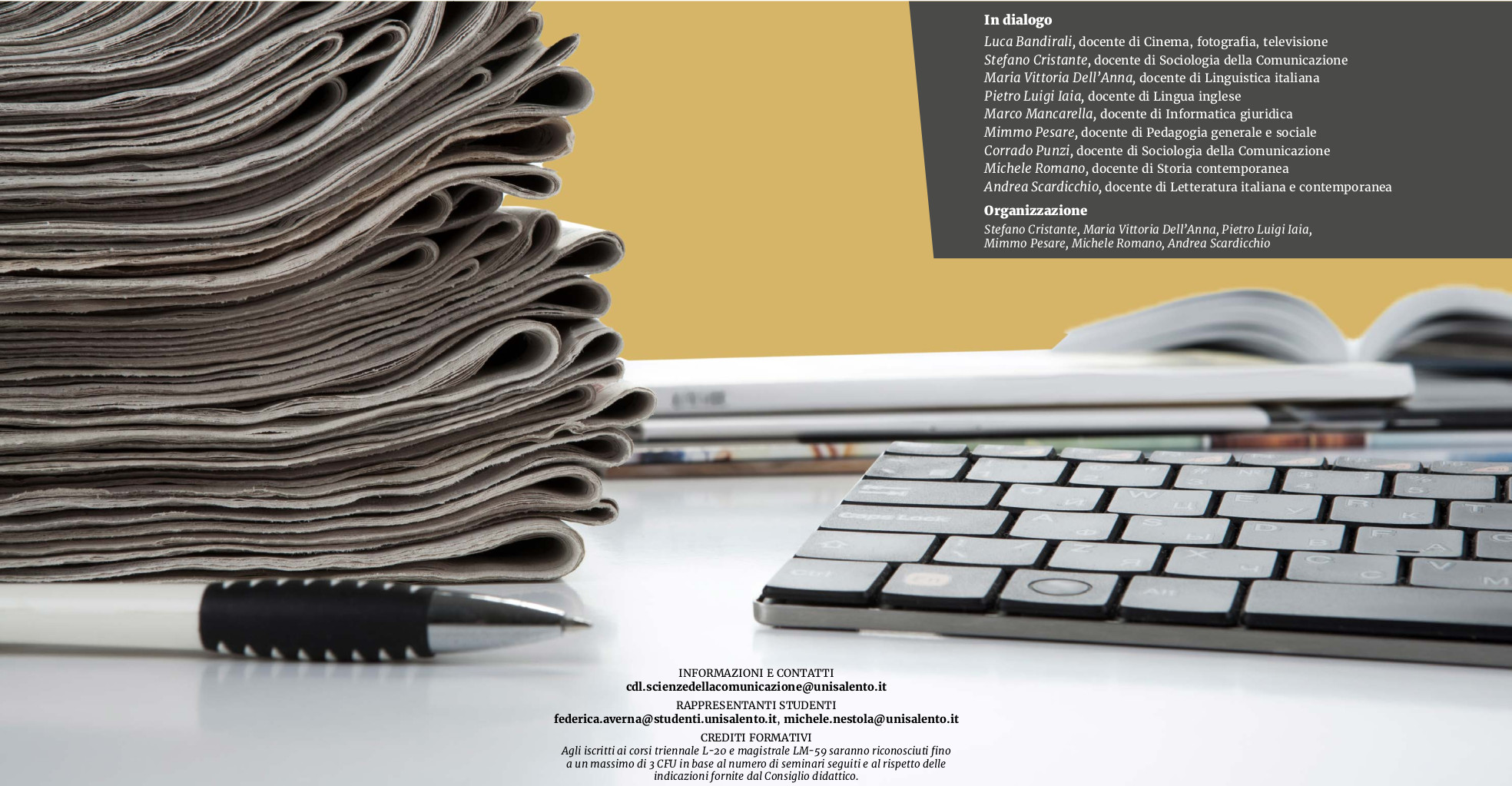 Al via giovedì 23 marzo 2023 il ciclo di seminari “Comunicazione incontra”, organizzato dai corsi di studio dell’Università del Salento in “Scienze della comunicazione” e “Comunicazione pubblica, economica e istituzionale” del Dipartimento di Studi umanistici: 18 incontri settimanali, fino al 22 giugno, per ragionare del mestiere di comunicare. Con docenti dell’Ateneo salentino e di altre università italiane, giornalisti/e ed esperti/e di comunicazione, si parlerà di giornalismo politico e d’inchiesta, geopolitica, cronaca giudiziaria e processo mediatico, conduzione televisiva e radiofonica, conduzione di telegiornali, organizzazione di eventi culturali, giornalismo culturale e ambiente, marketing territoriale ed enogastronomia, social media e ufficio stampa, comunicazione sui social e giornalismo musicale, fotografia digitale, linguaggio di genere nei media e nel giornalismo, comunicazione e informazione nell’era dell’intelligenza artificiale. «Un dibattito a più voci che incrocerà tanti degli interessi di studio e via via professionali degli studenti dei corsi di area Comunicazione di UniSalento», spiega la professoressa Maria Vittoria Dell’Anna, Presidente dei corsi, «e che possono fornire utili chiavi di lettura per un più vasto pubblico. L’iniziativa è organizzata anche in vista dell’avvio, nel prossimo anno accademico, del nuovo corso di laurea magistrale in “Comunicazione, media digitali e giornalismo”». Giovedì 23 marzo, alle ore 17.30 nell’aula 9 dell’edificio “Donato Valli” (viale Calasso 7, Lecce), il ciclo di incontri sarà aperto dai saluti del Rettore Fabio Pollice, della Direttrice del Dipartimento di Studi umanistici Maria Grazia Guido, del Delegato alla Comunicazione Stefano Cristante e della Presidente dei corsi di studio di area Comunicazione Maria Vittoria Dell’Anna. Di “Giornalismo e geopolitica” parlerà poi Raffaele Gorgoni, già inviato Rai e saggista, che dialogherà con il professor Stefano Cristante. Tutti gli incontri si svolgeranno in presenza e saranno aperti al pubblico fino all’esaurimento dei posti in sala. Gli incontri del 30 marzo (“Giornalismo e politica”) e 13 aprile (“Cronaca giudiziaria, giustizia penale, processo mediatico”) sono accreditati per la formazione continua dei giornalisti, altri sono in corso di accreditamento. Programma completo in allegato.