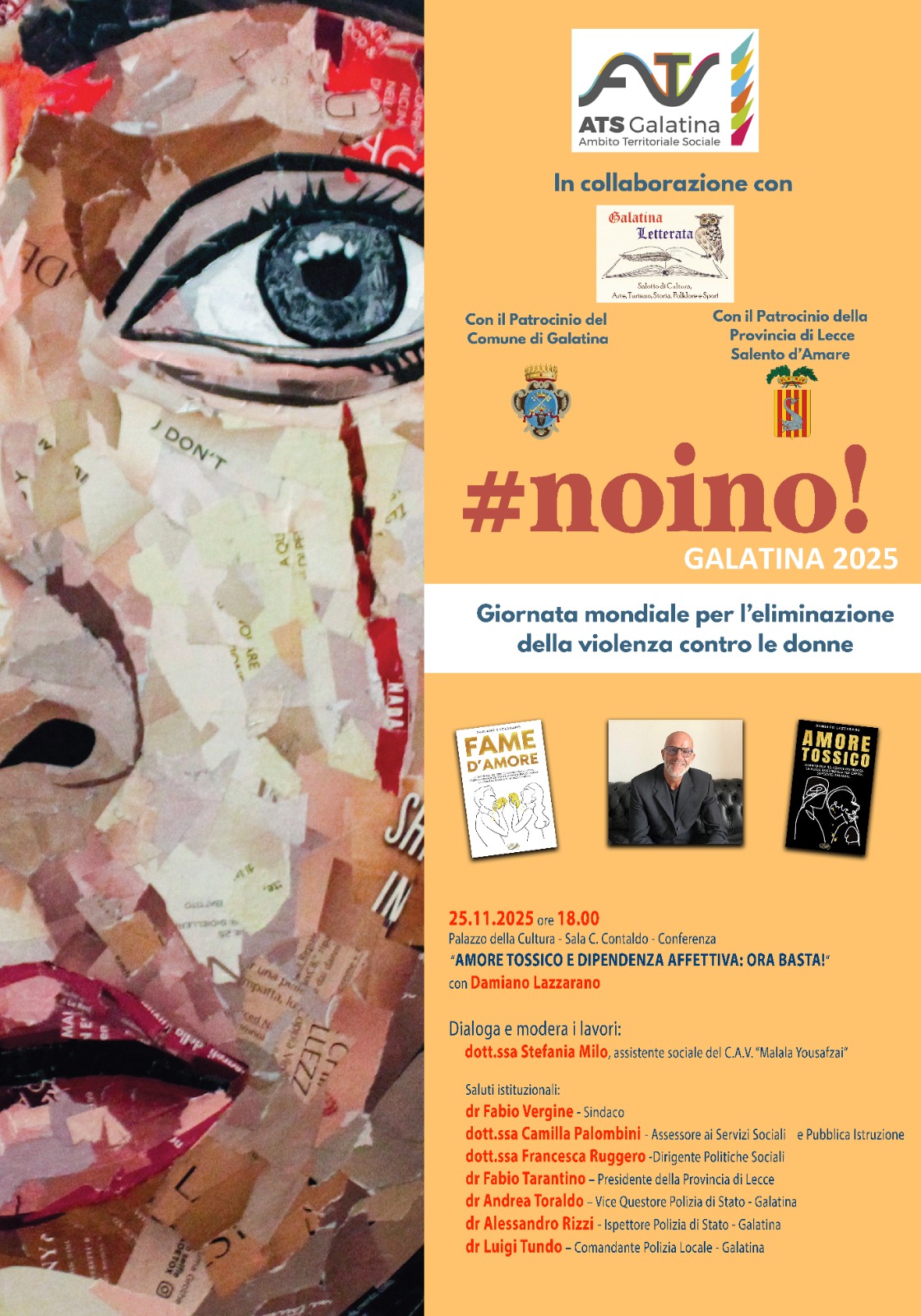 Dopo i saluti del Sindaco Fabio Vergine, dell’assessore ai Servizi Sociali Camilla Palombini, della Dirigente delle Politiche Sociali Francesca Ruggero e gli interventi del Vice Questore, Andrea Toraldo, del Commissariato PS di Galatina, dell’ispettore Alessandro Rizzi e del Comandante della Polizia Locale Luigi Tundo, il dr Lazzarano, oltre a spiegare come una persona si può liberare della dipendenza affettiva e distaccarsi emotivamente da un partner tossico e soprattutto come affrontare e superare una relazione amorosa infelice, risponderà alle domande di Stefania Milo, assistente sociale del C.A.V. “Malala Yousafzai” e del pubblico presente.