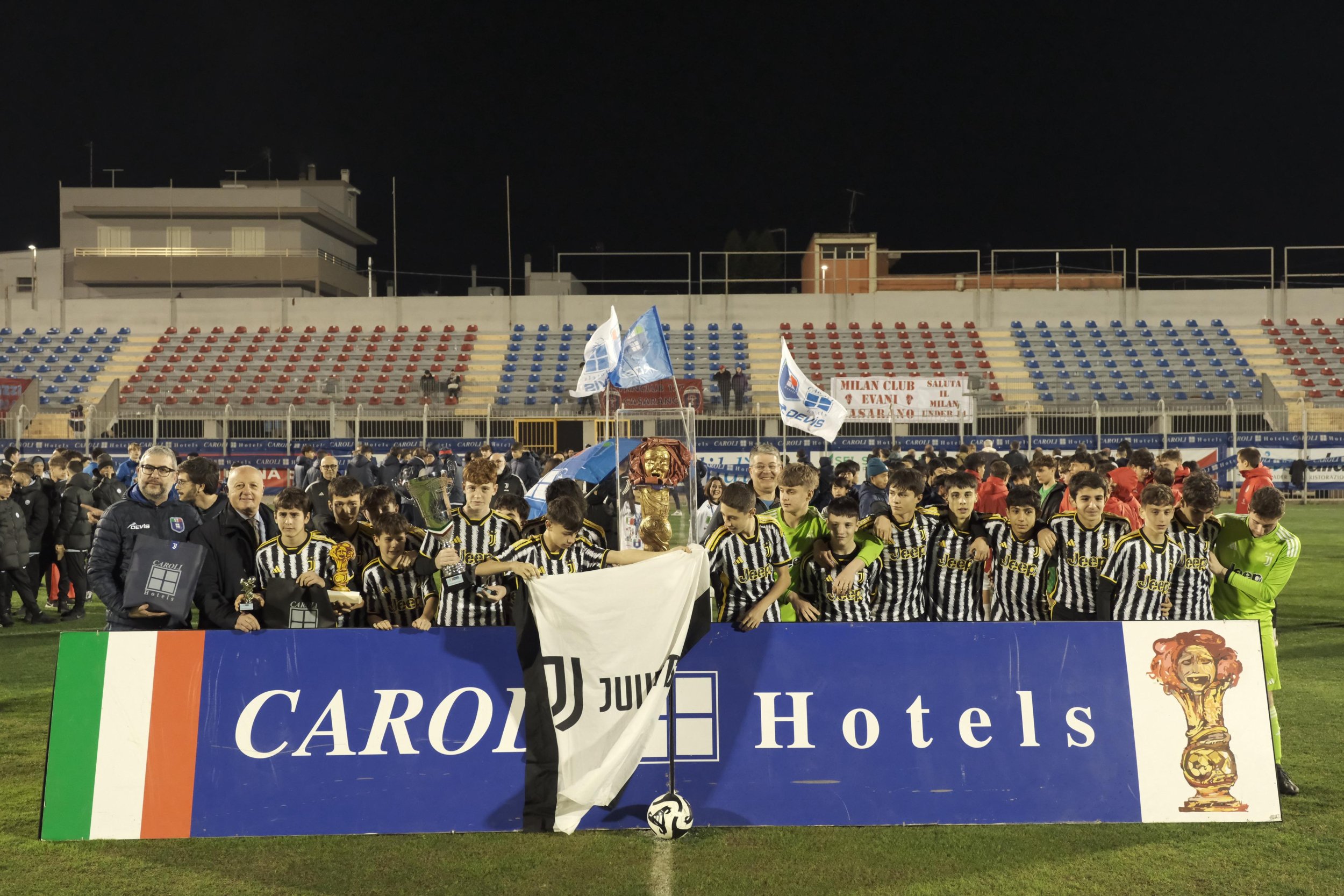 La Juventus si aggiudica il 20° Trofeo Caroli Hotels Under 14. Terzo successo per i bianconeri che non vincevano il prestigioso torneo, riferimento nazionale e internazionale per la categoria, dal 2004. Gara intensa e combattuta tra le due squadre nello splendido scenario dello stadio "Giuseppe Capozza" di Casarano gremito di spettatori. Il Milan passa dopo un giro di lancette con Kateete, poi Balbo pareggia in pieno recupero. Dopo un secondo tempo con il portiere milanese protagonista, si va ai supplementari. Al 3' la Juve ribalta il punteggio con una bellissima rete di Mosso. I bianconeri controllano il match sfiorando anche la terza rete nonostante gli sforzi del Milan. Il Milan, dopo la qualificazione nei gironi da prima davanti al Rimini, aveva eliminato in sequenza Monteruscello, Virtus Francavilla, Roma e Monza (in semifinale) mentre la Juve (seconda nel girone dietro il Cagliari) aveva superato Rimini, Bayer Leverkusen, Benfica e Bologna. Questi tutti i premi: Premi Stelle del Torneo Ab Stilcasa, Cristal Vetri, Muriccio, Mervm Enoteca, De Pascalis Impianti, Finora Consulting, Marss Mahosy, De Lorenzis Group, Fg Dol (9 premi): Arturs Jevdokimovs (Riga); Lorenzo Matera (Sassuolo); Owen Deffo (Bologna); Gabriel Minutillo (Bayer Leverkusen); Pietro Salvai (Juventus); Alessandro Ghiotto (Juventus); Daniel Chiffi (Monza); Leandro Dos Santos Braga (Roma); Hashim Kateete (Milan); Premio Best Player Tap Trans Adriatic Pipeline: Francisco Wang (Benfica); Premio Squadra Rivelazione Lavamama-Lavanderie Self & Industry: Tor Tre Teste; Premio Fair Play Relais Ena Gallipoli: Pasquale Foggia; Premio Miglior Allenatore Taktifol: Andrea De Martini; Premio Miglior Pubblico Panacea Gallipoli: Roma; Premio Terna Arbitrale: Federico Troisi, Giorgio Candido, Riccardo Bruno della sezione AIA di Casarano. Sono state ben quaranta le squadre partecipanti divise in 10 gironi: tra le big estere Benfica, Bayer Leverkusen e Riga oltre Inter, Milan, Juventus, Monza, Cagliari, Sassuolo, Rimini, Lecce, Toripletta Tokyo, Torino, Spal, Fiorentina, Piacenza, Bologna, Virtus Francavilla e Bari. Diciannove i comuni coinvolti: Castrignano del Capo, Gallipoli, Poggiardo, Castrignano de’ Greci, Collepasso, Galatone, Leverano, Melpignano, Ruffano, San Donato di Lecce, Parabita (Heffort Sport Village), Nardò (Centro Europa Sport), Casarano (Centro New Building e Stadio "Giuseppe Capozza"), Cavallino (Kick Off Sport Center), Copertino, Matino, Otranto, Tricase, Racale. La finale sarà trasmessa in differita su Sportitalia giovedì 15 febbraio alle 21:00. L’evento rientra nel network dei Trofei Caroli Hotels organizzato dall’Asd Capo di Leuca e dal noto gruppo alberghiero capeggiato dal direttore generale Attilio Caroli Caputo. Soddisfatti della riuscita della manifestazione, non solo dal punto di vista sportivo ma anche e soprattutto turistico, i componenti della segreteria organizzativa Mario Caputo e Daniele Pisacane.