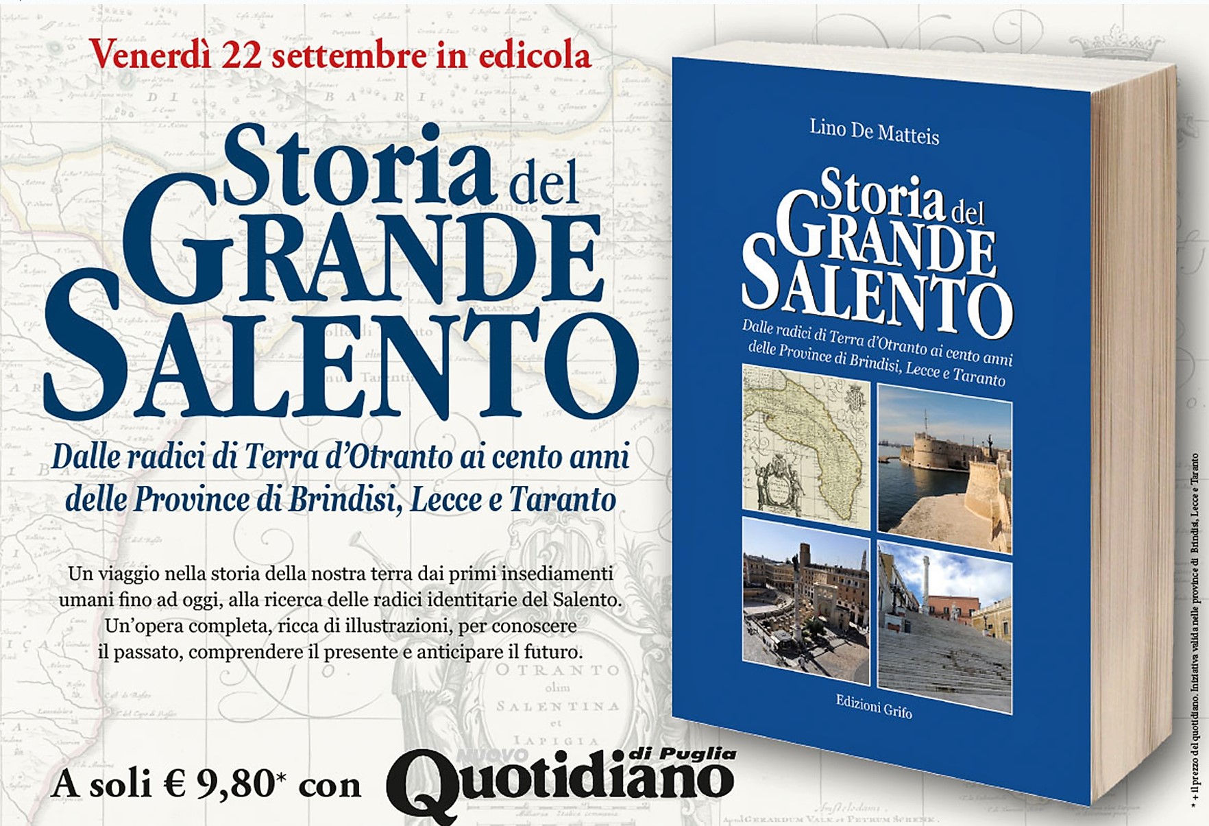 Da domani, 22 settembre 2023, in promozione col Quotidiano, nelle edicole di Brindisi, Lecce e Taranto il libro “STORIA DEL GRANDE SALENTO Dalle radici di Terra d’Otranto ai cento anni delle Province di Brindisi, Lecce e Taranto” (Edizioni Grifo).