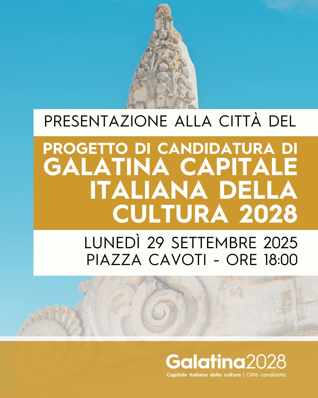 "Lunedì 29 settembre 2025, alle ore 18:00, in piazza Cavoti, sarà presentato alla comunità il progetto di candidatura di Galatina Capitale Italiana della Cultura 2028." L'annuncio è apparso sulle pagine social del Comune. "Il progetto “Il Sogno dei luoghi – ritmi, morsi e trasformazioni”, si spiega nel testo, è una visione culturale corale e innovativa che nasce nel cuore del Salento, a Galatina, città ricca di storia, tradizioni popolari e patrimonio immateriale." "La Città tutta è invitata a partecipare per condividere contenuti e step successivi, perché il percorso di partecipazione non si ferma, ma continua! In caso di pioggia, l'evento si terrà presso il Palazzo della Cultura, in Piazza Alighieri n. 51."