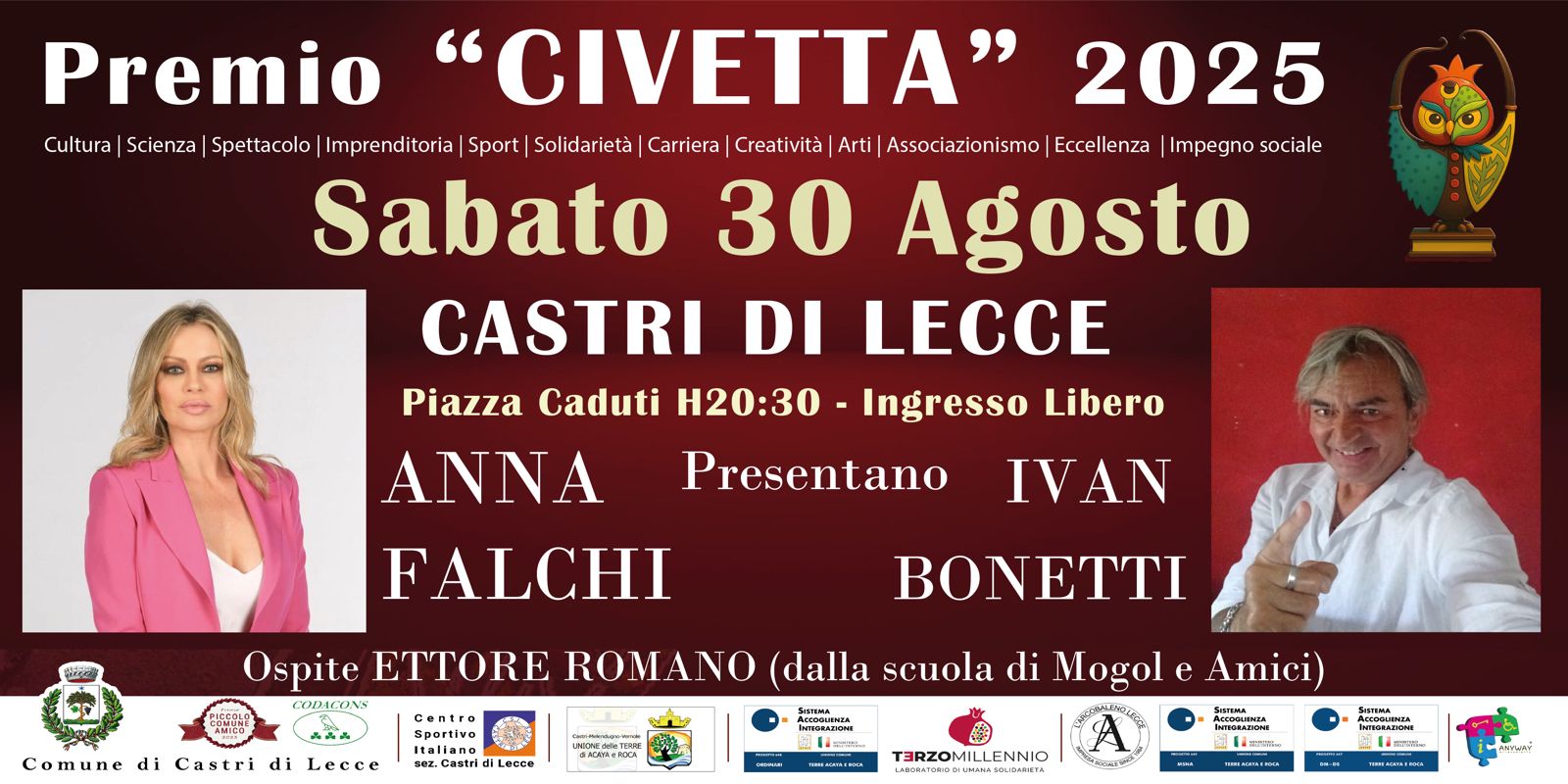 Castrì di Lecce si prepara ad accogliere l’edizione 2025 del Premio Civetta, in programma sabato 30 agosto alle ore 20:30 in Piazza Caduti, con ingresso gratuito.