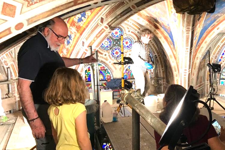 (Nelle Foto: Sergio Fusetti ripreso quando esce miracolosamente incolume dalla basilica durante il terremoto. Immagini degli ultimi restauri degli affreschi di Simone Martini nella Cappella di San Martino della Basilica Inferiore di San Francesco, diretti dal Maestro Fusetti ed effettuati dal suo Team. Antonaci, in Municipio, ad Assisi con il Sindaco Stefania Proietti.)
