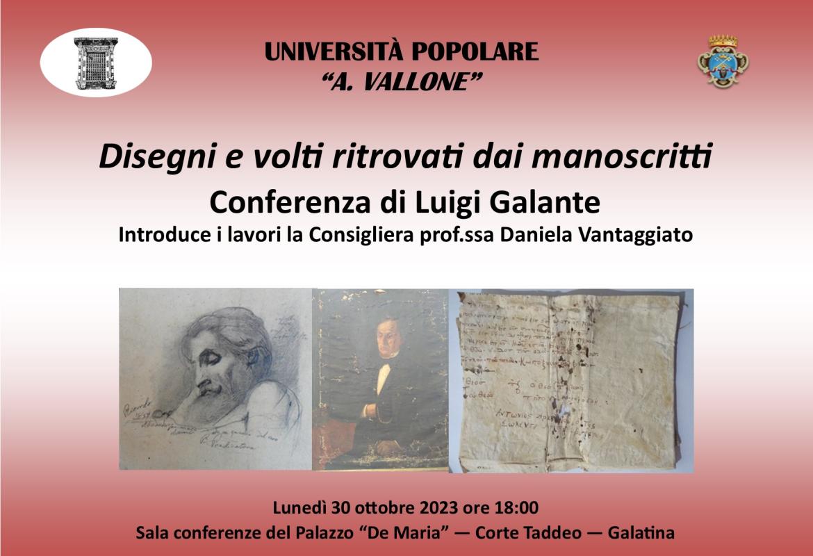 Secondo incontro, oggi lunedì 30 ottobre alle ore 18:00, nella Sala conferenze del Palazzo "De Maria", in Corte Taddeo, del Corso dal titolo "Il territorio: focus sul Salento e la Puglia", organizzato dalla Università Popolare “Aldo Vallone”. Titolo dell’evento odierno è “Disegni e volti ritrovati dai manoscritti”