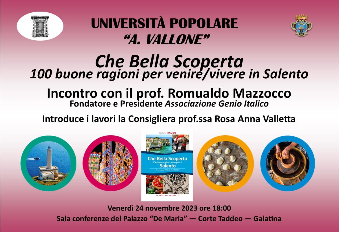 Oggi venerdì 24 novembre 2023 alle ore 18:00, nella Sala conferenze dell’ex Palazzo De Maria, in Corte Taddeo, la programmazione dell’offerta formativa dell’Università Popolare “Aldo Vallone” prevede