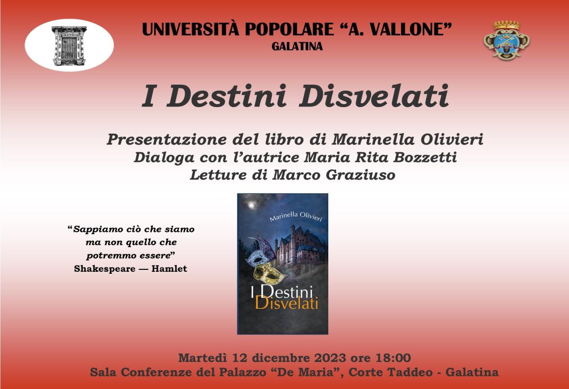 Oggi martedì 12 dicembre 2023, alle ore 18:00, nella Sala Conferenze del Palazzo “De Maria”, in Corte Taddeo, avrà luogo la presentazione del romanzo “I Destini Disvelati” (2023) di Marinella Olivieri,