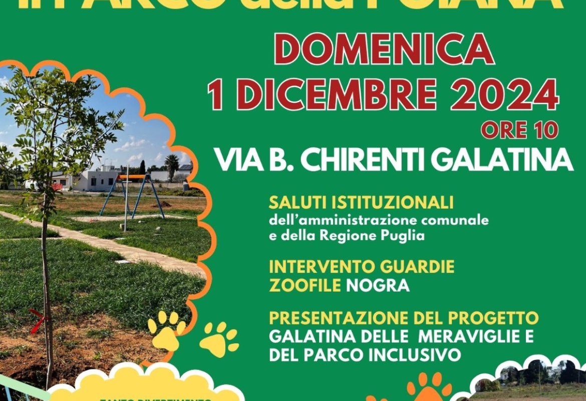 L'1 Dicembre 2024, a Galatina, in via B. Chirenti, alle ore 10, verrà inaugurato il Parco della Poiana.
