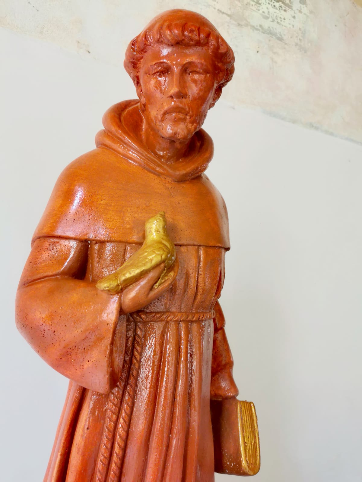 La mano sinistra regge un libro, il Vangelo stesso, radice di quella pace che non è solo aspirazione del cuore e traguardo della fede ma progetto concreto e quotidiano che ha bisogno, per realizzarsi, dei nostri passi umani. Questo sembra volerci ricordare l’autore presentando Francesco mentre muove il suo cammino verso l’osservatore, chiamato così a interrogarsi sui propri passi nel mondo, sul proprio amore per il creato, sul senso che vuole dare alla propria vita.
