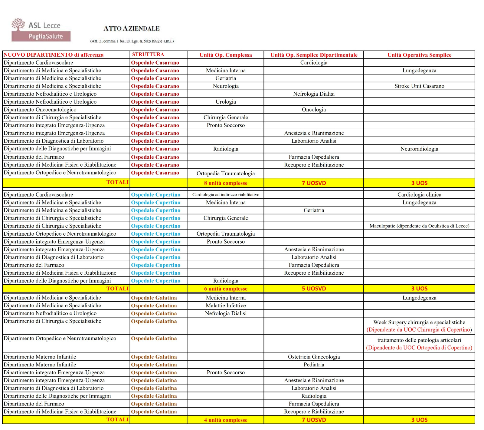 Ps : allego uno schema riassuntivo di quanto previsto nell’atto aziendale ASL Lecce ponendo a confronto quanto si intende fare per i tre Ospedali periferici