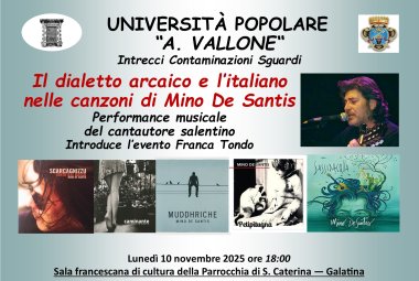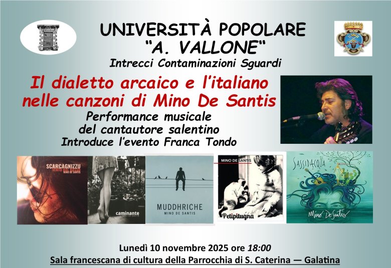Oggi lunedì 10 novembre 2025 alle ore 18:00, nella Sala francescana di cultura della Parrocchia di Santa Caterina, in Piazza Orsini, l’Università Popolare “Aldo Vallone” ha prog