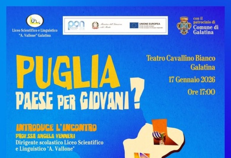 Sabato 17 gennaio 2026, alle ore 17, presso il Teatro Cavallino Bianco, si terrà il convegno Puglia, Paese per Giovani?, promosso dal Liceo Scientifico e Linguistico “A.