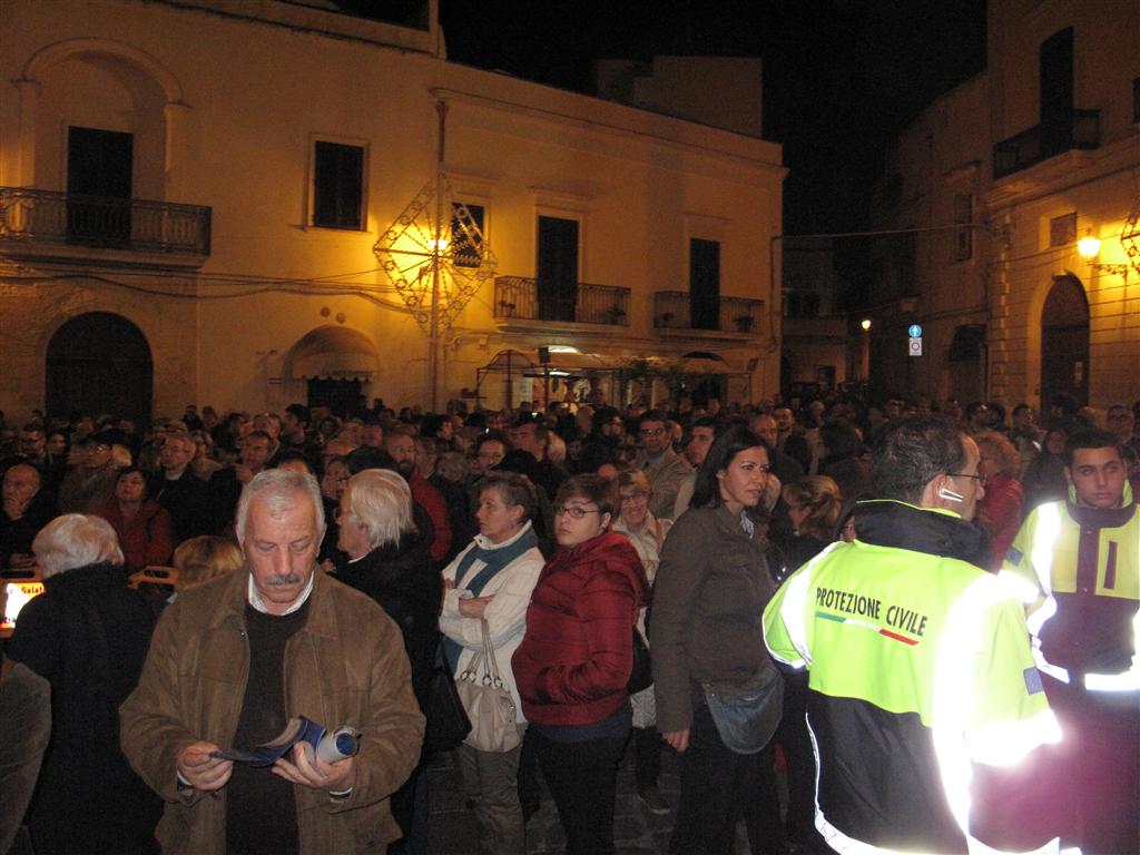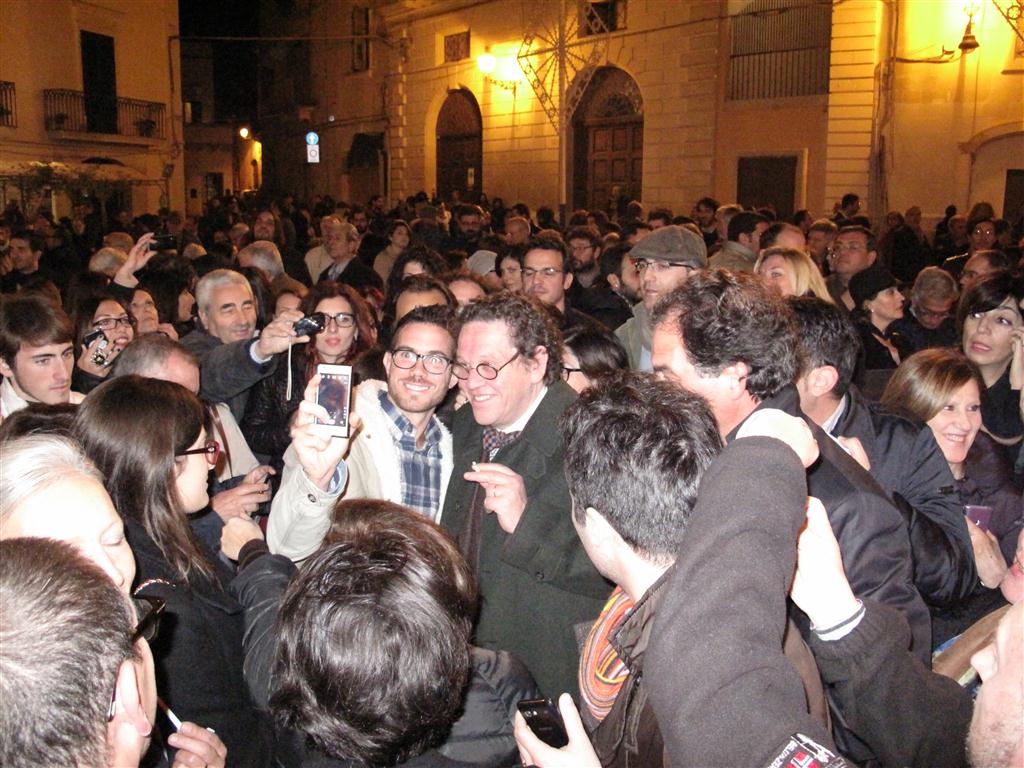 “Non mi aspettavo tanta partecipazione”. Philippe Daverio è costretto ad entrare nella Basilica di Santa Caterina d’Alessandria passando per il Chiostro. La chiesa è gremita. Le persone rimaste fuori (almeno cinquecento) fanno ressa sugli ingressi e si accalcano attorno al maxischermo che trasmetterà la sua lezione magistrale. Il professore dell’Università di Palermo riesce a raggiungere il primo gradino dell’altare passando dalla sagrestia scortato dal parroco, fra’ Rocco Cagnazzo. Il Sindaco, Cosimo Montagna e Daniela Vantaggiato, assessore alla cultura, si seggono sugli altri gradini (i banchi riservati alle autorità sono stati tutti occupati). Antonio Cassiano, direttore emerito del museo provinciale, presenta il famoso giornalista e critico d’arte e si accomoda anche lui per terra.