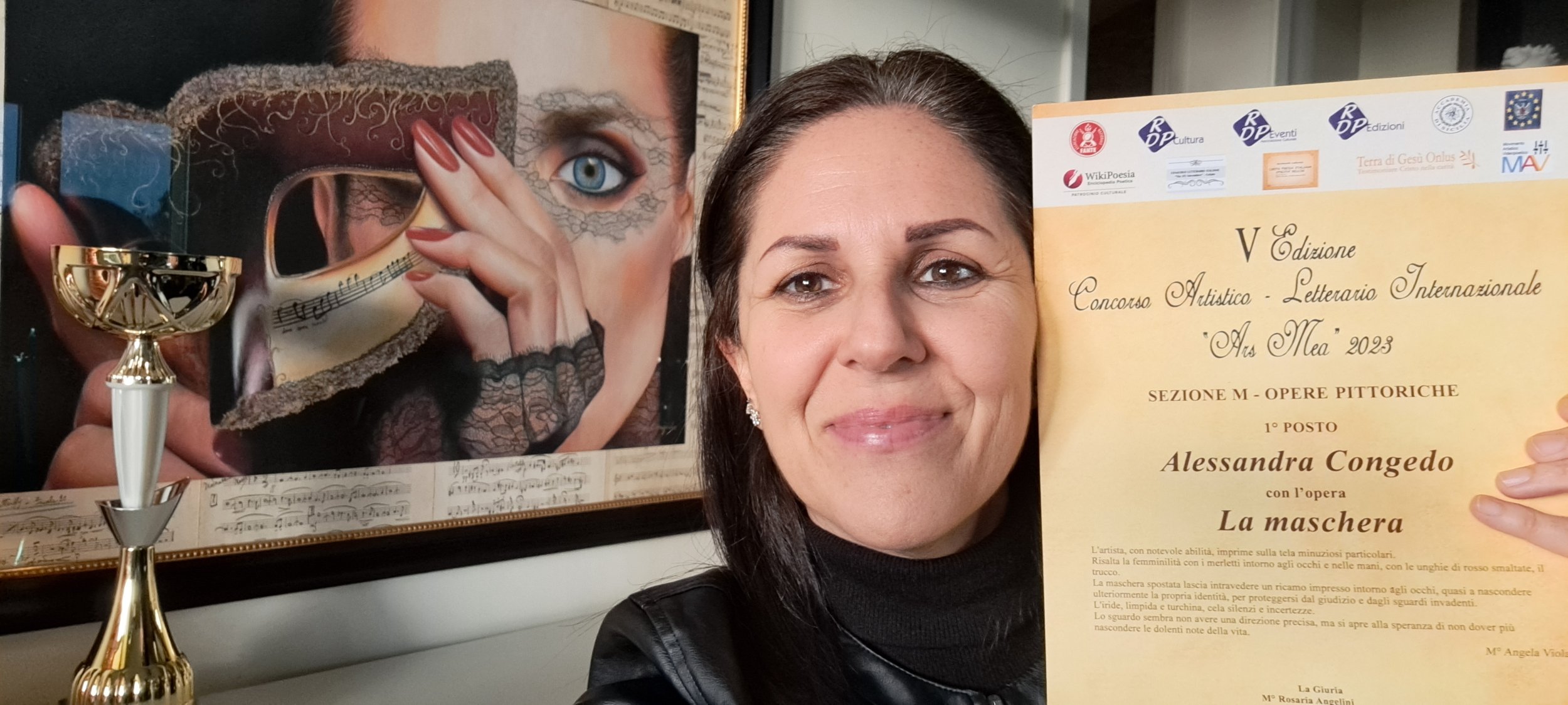 Alessandra Congedo, docente e musicista galatinese, ha vinto il primo premio nella Sezione M dedicata alle opere pittoriche con il disegno “La maschera” ed ha ricevuto il Premio speciale “Achille Baratta” con “Il fiore del deserto”.