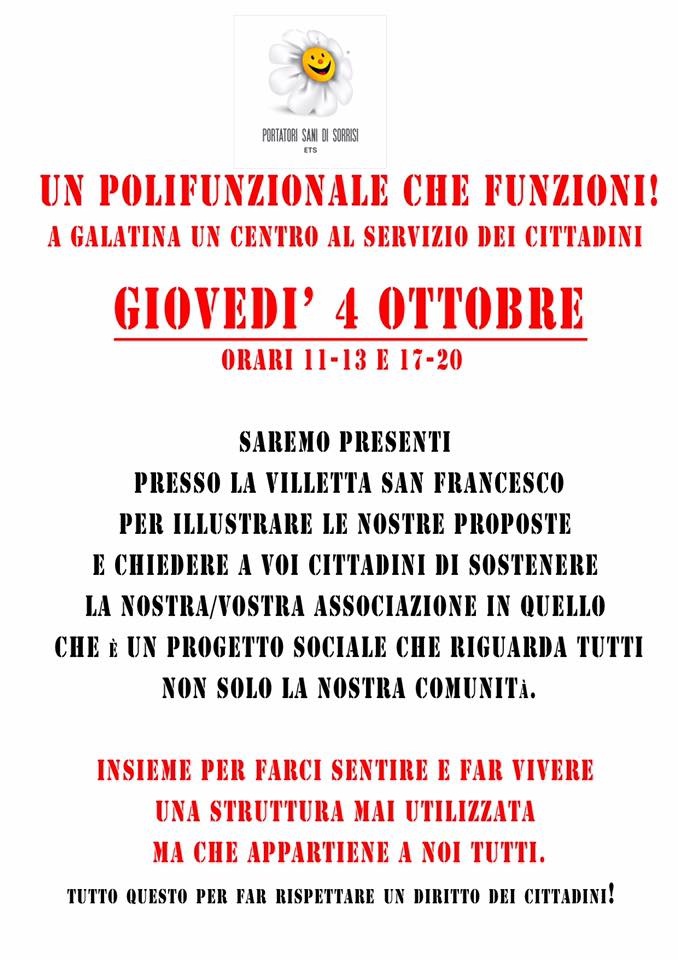 "Salve, (...) sono a chiedere a nome di tutti i volontari presenti in questa associazione di poter esser custodi dello spazio comunale denominato Polivalente "Colazzo" sito in viale Don Bosco." A firmare una lettera-petizione rivolta a Marcello Amante, Sindaco di Galatina, e ai due assessori Nico Mauro e Loredana Tundo è Pierangelo (Ciccio Brutto) Muci, presidente dell'Associazione Portatori sani di sorrisi, anche attraverso la sua pagina facebook dove annuncia una raccolta di firme per giovedì 4 ottobre dalle ore 11 alle 13 e dalle ore 17 alle 20 in piazza Cesari.