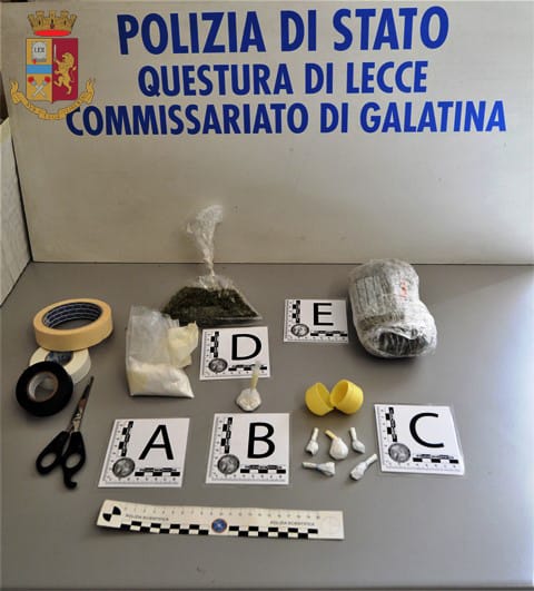Gli Agenti della Polizia di Stato della Squadra Investigativa del Commissariato di Pubblica Sicurezza di Galatina, nel corso dell’attività rivolta al contrasto dei reati legati al traffico di sostanze stupefacenti, hanno, oggi, arrestato in flagranza di reato C. A. un 32enne di Galatina. L'uomo è stato sottoposto a perquisizione personale e domiciliare e, nelle operazioni di ricerca nell’abitazione, gli investigatori hanno trovato, in un contenitore di plastica trasparente munito di coperchio, oltre 110 grammi di marijuana e circa 50 grammi di cocaina, distribuita in vari involucri, oltre a diverso materiale utilizzato per il confezionamento delle dosi di stupefacente.