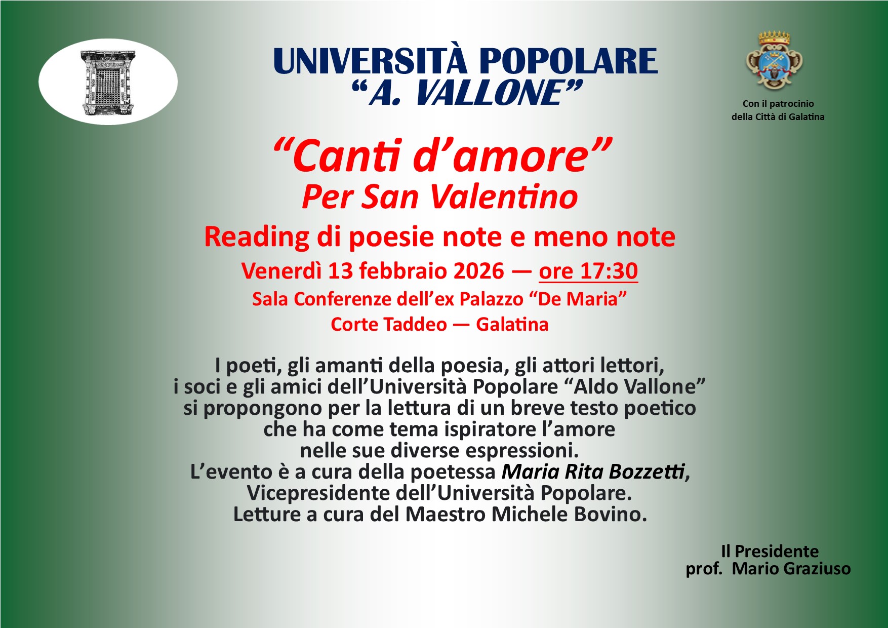 Oggi venerdì 13 febbraio 2026, alle ore 17:30, nella Sala Conferenze dell’ex Palazzo De Maria, in Corte Taddeo, l’Università Popolare “Aldo Vallone” ha organizzato un “Reading” di poesie note e meno note dal titolo “Canti d’Amore – Per San Valentino”, per dare voce ai poeti e alle poetesse, agli amanti della poesia, agli attori lettori, ai soci ed amici della nostra associazione che proporranno la lettura di brevi testi poetici che avranno come tema ispiratore l’amore nelle sue diverse espressioni.