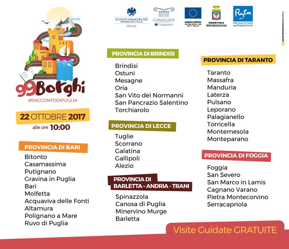 Domenica 22 ottobre prossimo ritornerà anche nel Salento l’appuntamento con l’iniziativa “99 Borghi - #raccontodiPuglia” promossa da Confcommercio Puglia in collaborazione con Confguide Puglia, Regione Puglia e Pugliapromozione. Si tratta di un progetto che ha lo scopo di far riscoprire i borghi di Puglia spesso turisticamente dimenticati ma ricchi di storie e tradizioni, grazie alle guide turistiche abilitate dalla Regione Puglia, organizzate da Confguide – Confcommercio, le quali, garantendo professionalità e competenza, saranno ambasciatori del territorio e operatori per la divulgazione della conoscenza, dello stile di vita e dell’immagine turistica del territorio e della comunità.