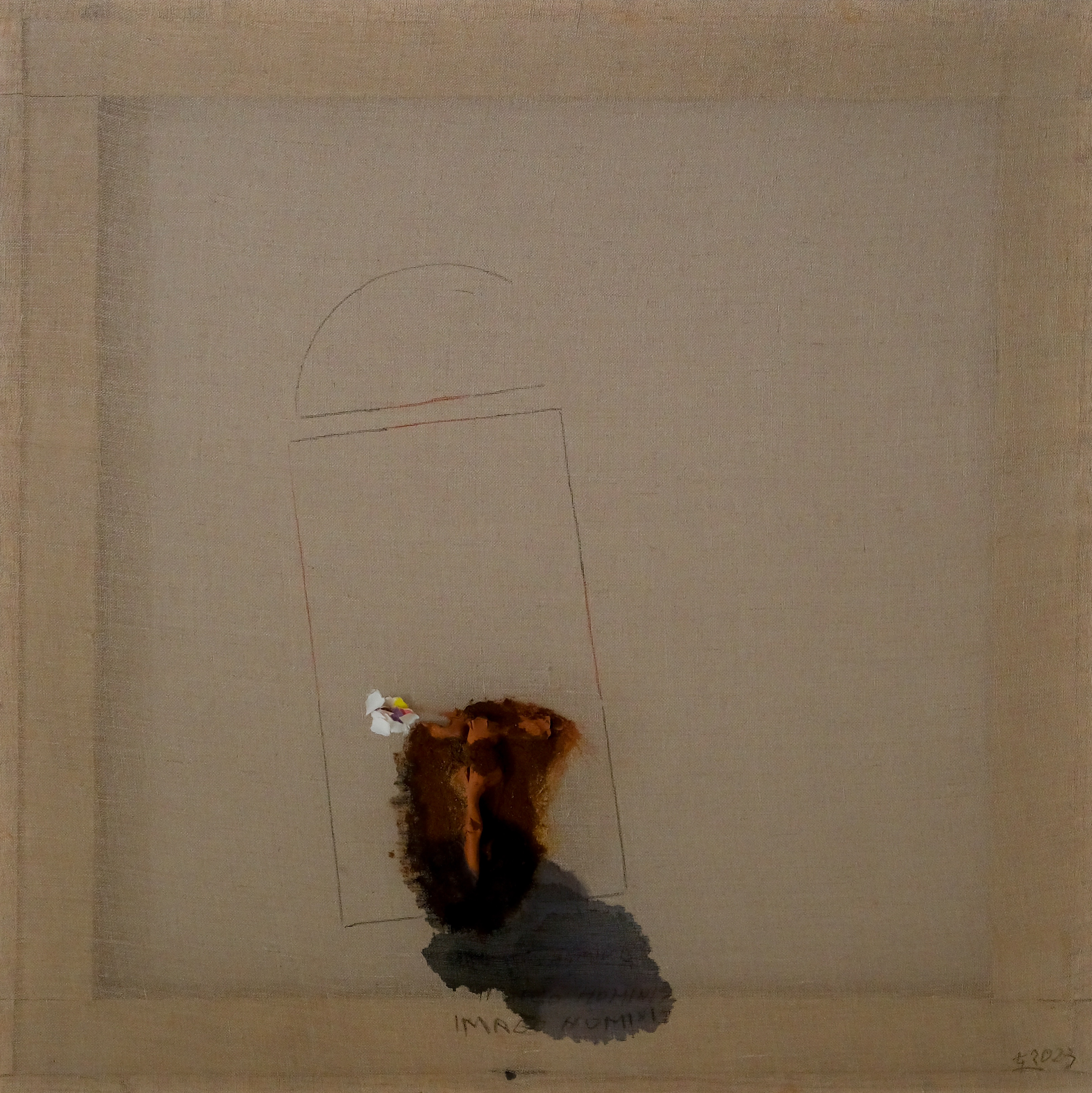 In Imago Hominis è l’umilissimo pugno di terra ma, che giace più in profondità – perché come dice Sambati: «Io i materiali me li vado a cercare» – ancora nutrito e custodito dai legami invisibili, che fanno ricca la possibilità dei semi. Una qualità di colore più intenso di terra, humus, basta a creare lo sfondo, l’appoggio, la dimora della figura, del corpo che ne viene fuori… di terra anch’esso.