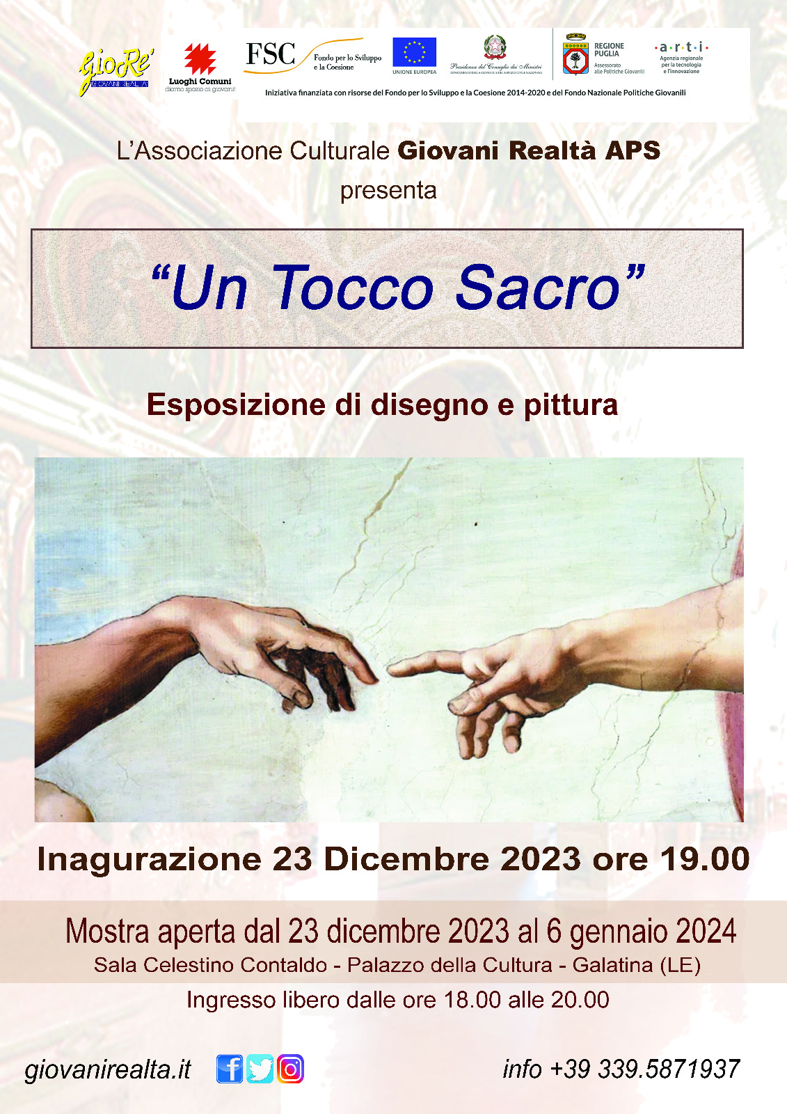 Alle ore 19 del 23 Dicembre 2023, presso Open Art, nella sala “C. Contaldo” del Palazzo della Cultura sarà inaugurata la mostra di disegno e di pittura riservata agli artisti che hanno aderito alla call “Un tocco sacro”, promossa dall’Associazione di promozione sociale Giovani Realtà.