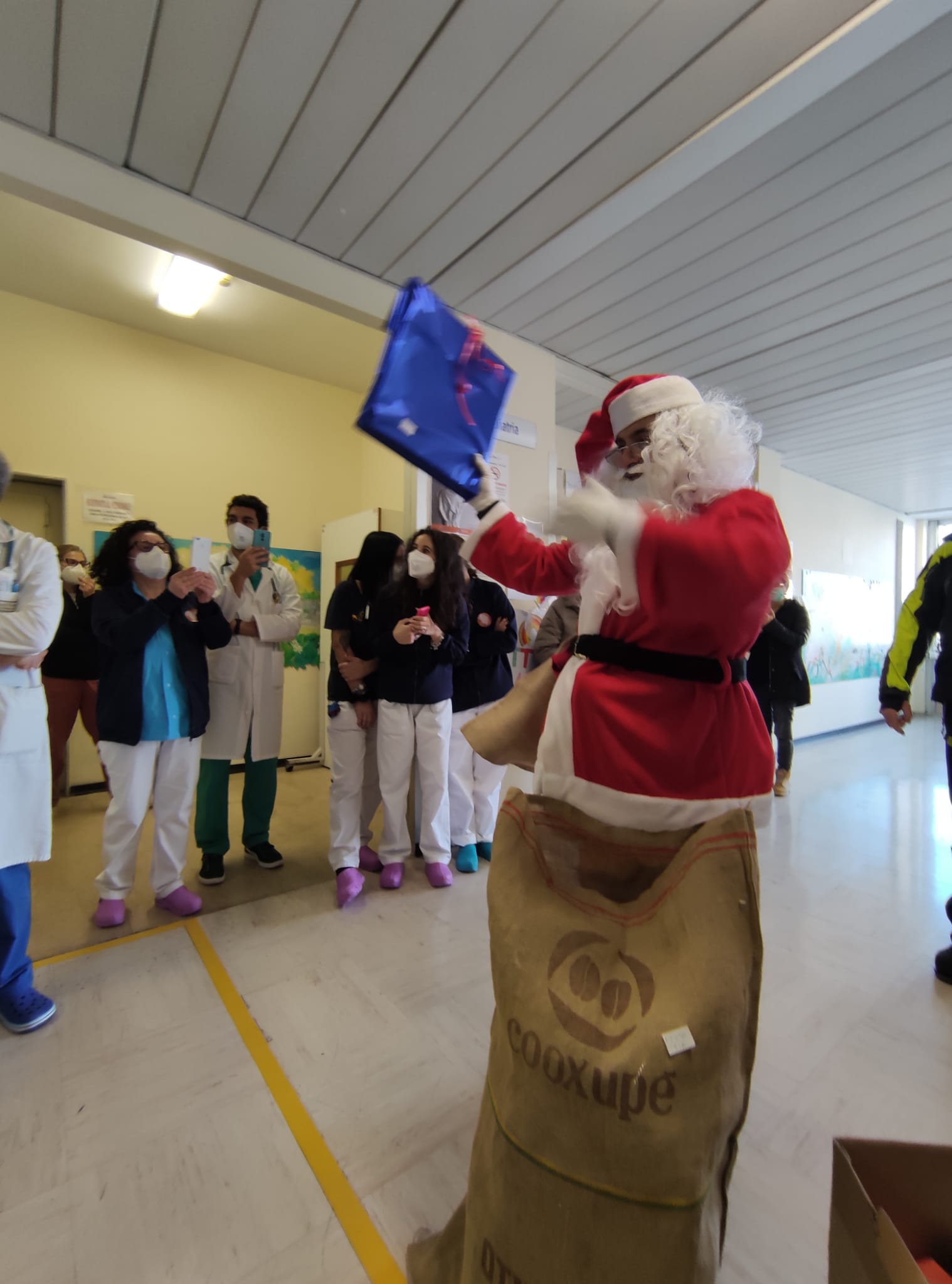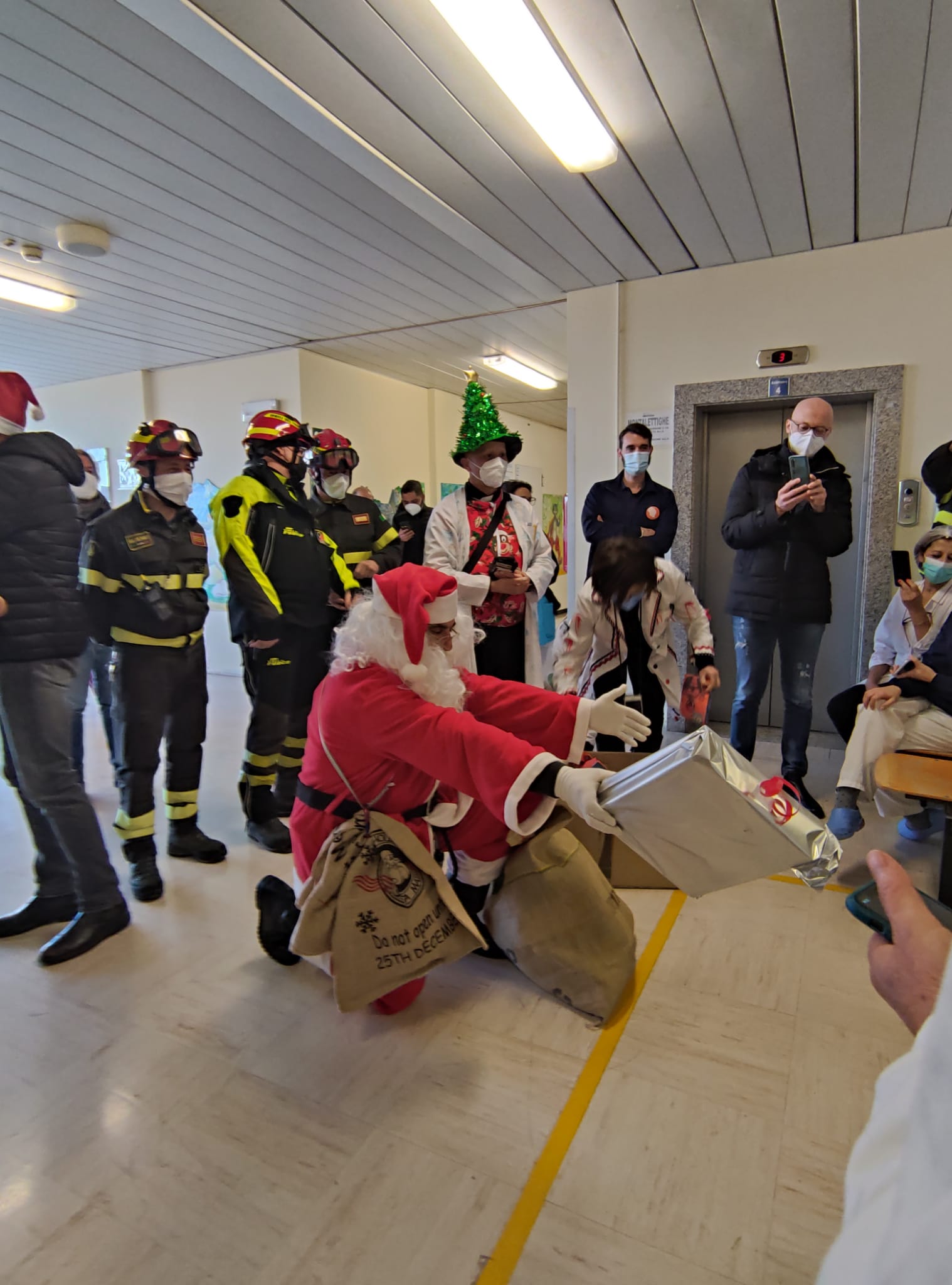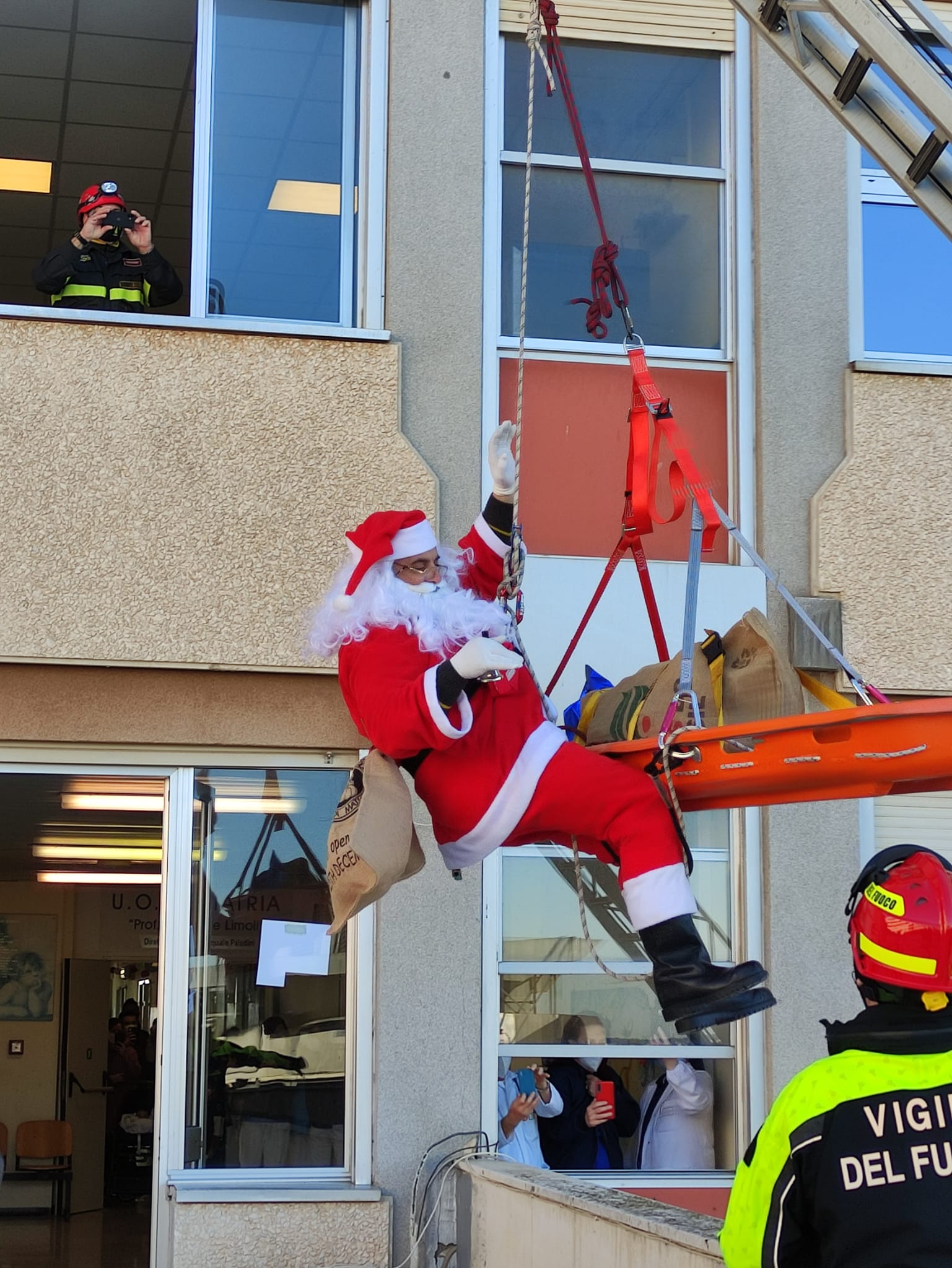 È accaduto ieri mattina, in pieno clima natalizio, i piccoli pazienti, ricoverati presso i reparti di Pediatria e di Chirurgia pediatrica del 'Fazzi', hanno visto arrivare dal tetto del nosocomio salentino, un Babbo Natale coraggiosissimo che, imbracato a una fune, portava con sé tanti doni. È stato possibile grazie al consolidato sodalizio tra l’Associazione “Cuore e mani aperte” Odv, presieduta dal cappellano del presidio ospedaliero, Don Gianni Mattia, da sempre particolarmente sensibile al tema della umanizzazione delle cure e degli spazi ospedalieri e il Comando provinciale dei Vigili del Fuoco, guidati dal comandante ingegnere Antonio Panaro. Unendo la visione d'amore di Don Gianni con quella di uomini le cui divise oggi sempre con più forza li rende eroi e angeli, si è regalato un momento di distrazione dalla routine ospedaliera ai piccoli pazienti ricoverati in questi giorni di festa e alle loro famiglie che nel loro accudire, sostenere, sorridere anche quando quel sorriso non lo si sente, insegnano che il Natale è amore e l'amore può essere donato. Torniamo a regalare sogni e magia dopo un lungo periodo che ci ha visti impossibilitati ad aprire le braccia per abbracciarvi tutti, come ci è sempre piaciuto pensare di poter fare – sono le parole con cui Don Gianni Mattia ha commentato la sorpresa ai piccoli pazienti - Questa lontananza fisica ci ha però mostrato come l'amore trovi sempre il modo di raggiungere i suoi scopi e riempire i cuori di chi si predispone per accoglierlo. Nonostante non potessimo abbracciarci, non sono mai mancati i gesti di solidarietà e di vicinanza non all'associazione, ma alla sua essenza, a quella catena d'amore che, con l’aiuto del prossimo, è stato possibile forgiare e rendere sempre più forte e bella. Oggi è stato possibile alzare gli occhi al cielo e vedere realizzarsi il sogno dei bambini: Babbo Natale è arrivato anche in ospedale. L'ospedale è un luogo dove le paure si risvegliano, ma che può anche diventare, ed è diventato, un luogo di speranza, dove i sogni possono ancora realizzarsi. Torneremo ad abbracciarci, a sfiorarci a vivere la fisicità senza timore e sarà bellissimo. Esiste il dolore, esistono i silenzi legati alla paura, ma ci sono anche i bambini che sanno darci coraggio, i bambini che ci sorridono e si affidano alle nostre mani, bambini che sanno ancora essere pieni di vita e mostrarci quanto essa sia bella. E poi ci sono gli uomini e le donne, quelli che hanno saputo far diventare un dolore, una lacrima, una fonte di amore immensa, coloro che nonostante tutto vanno avanti e si colorano il cuore e le mani, coloro che con nasi rossi ci sottraggono alla solitudine, uomini e donne che indossano camici e ci strappano alla malattia e poi ci sono quelli che si calano dal cielo e a noi sembra una magia e forse lo è davvero.