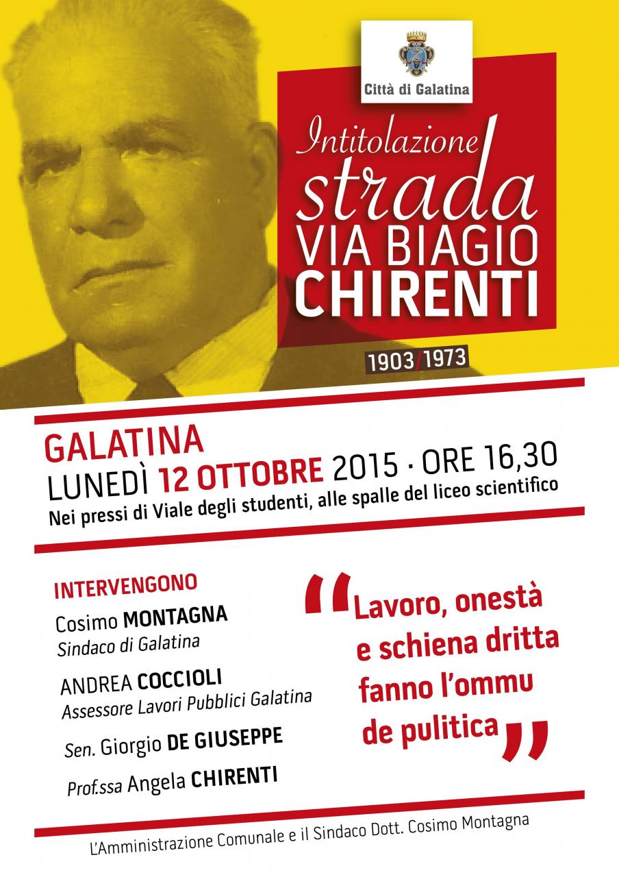 "Lavoro, onestà e schiena dritta fanno l'ommu de pulitica". Questa frase di Biagio Chirenti campeggia sul manifesto e sull'invito alla cerimonia di intitolazione di una strada nei pressi del Liceo Scientifico all'ex-Sindaco comunista di Galatina. L'appuntamento a cui prenderanno parte Angela Chirenti, figlia di Biagio, Cosimo Montagna, Andrea Coccioli e Giorgio De Giuseppe, si svolgerà lunedì 12 ottobre alle ore 16:30 nelle vicinanze del viale degli Studenti.