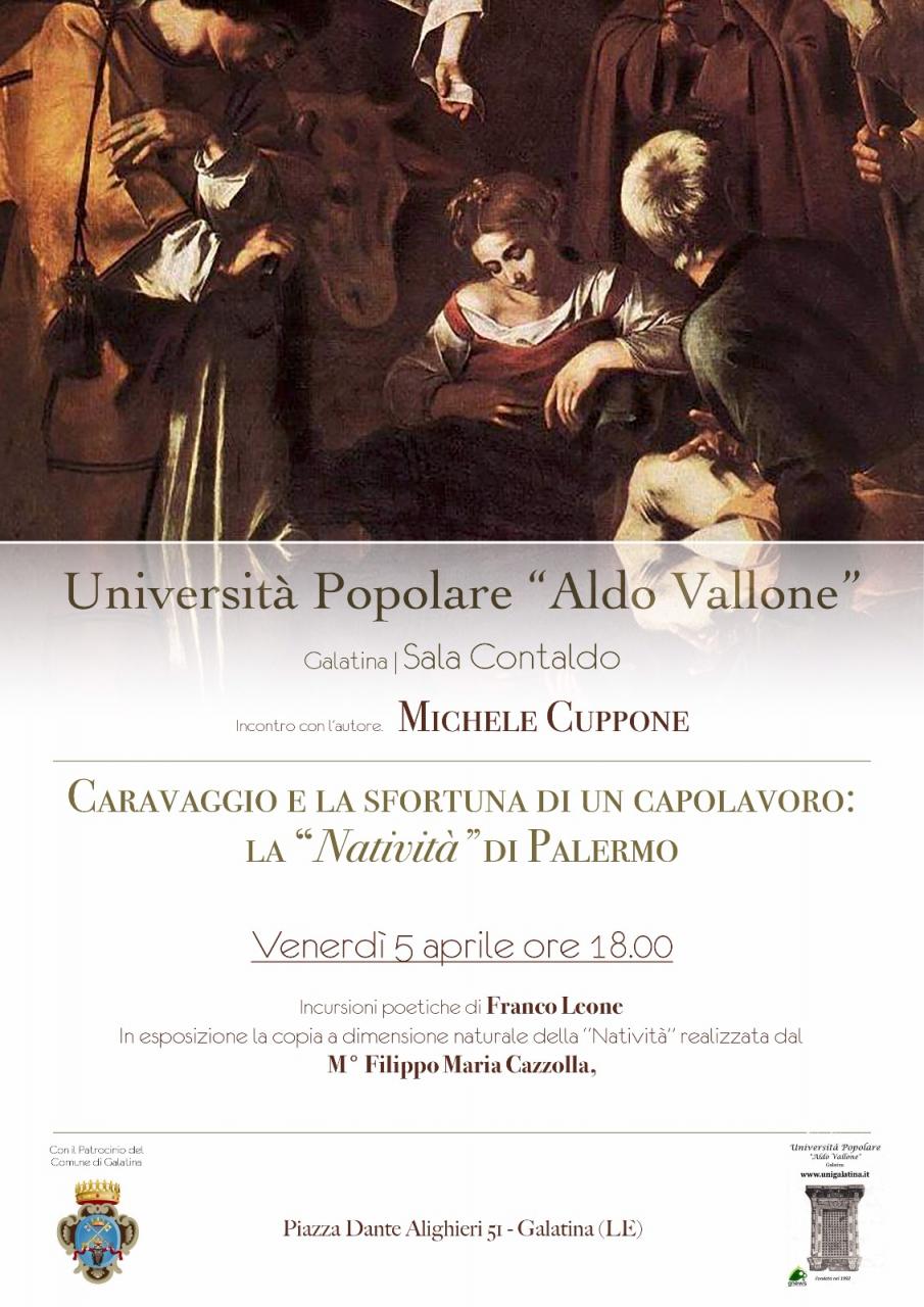 Venerdì 5 aprile alle ore 18,00 presso la sala Contaldo della Biblioteca Comunale "Pietro Siciliani" di Galatina, l'Università Popolare "Aldo Vallone" propone un incontro culturale intitolato Caravaggio e la sfortuna di un capolavoro: la Natività di Palermo. Il ricercatore e studioso di Caravaggio Michele Cuppone, autore di diverse pubblicazioni scientifiche sul tema, parlerà del celebre quadro rubato nel 1969 dalla mafia e su cui i collaboratori di giustizia hanno ora rivelato nuovi retroscena. Si farà luce sulla genesi dell'opera, che grazie alle ultime scoperte è possibile collocare cronologicamente non più durante il periodo siciliano dell'artista, ma a cavallo tra due celebri cicli pittorici romani: La Cappella Contarelli di San Luigi dei Francesi e la Cappella Cerasi in Santa Maria del Popolo. Prevista la proiezione di documenti audiovisivi tra cui l'unico filmato a colori della tela, risalente agli anni '60. Per l'occasione inoltre sarà esposta una copia a dimensione naturale del dipinto, realizzata dal M° Filippo Maria Cazzolla. Un ultimo contributo sarà dato dalle incursioni poetiche di Franco Leone, autore del volume Caravaggio Poesia della Luce.