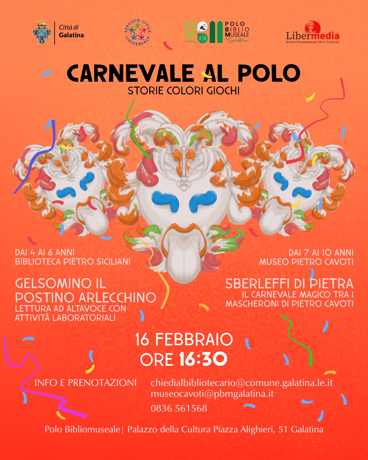 Il fascino del Carnevale incontrerà la cultura nel cuore di Galatina. Il prossimo 16 febbraio 2026, a partire dalle ore 16:30, il Polo Bibliomuseale aprirà le porte del Palazzo della Cultura (Piazza Alighieri, 51) per l’evento "Carnevale al Polo – Storie, Colori, Giochi", un’iniziativa dedicata ai bambini dai 4 ai 10 anni.