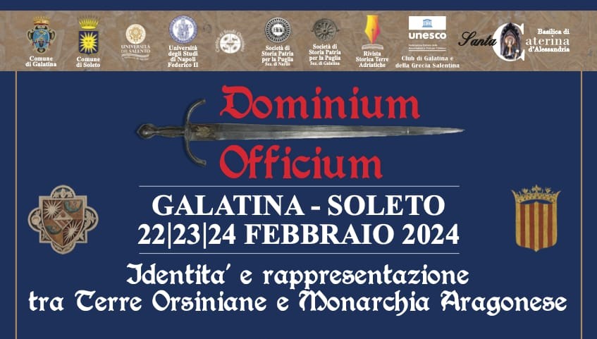 Nei giorni dal 22 al 24 febbraio 2024 in Galatina, nella Basilica di Santa Caterina d’Alessandria, si svolgerà un convegno internazionale dal titolo: “Dominium, Officium. Identità e rappresentazione tra Terre Orsiniane e Monarchia Aragonese”.