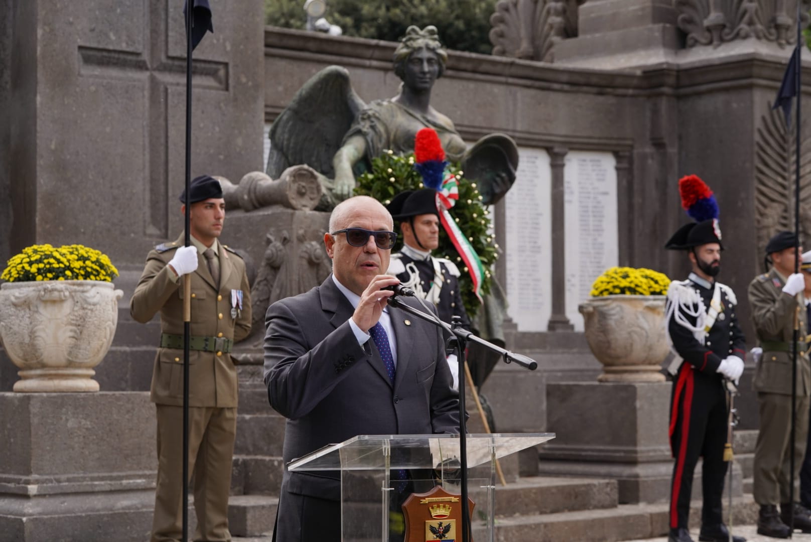 La manifestazione è proseguita alle ore 10.:30, in Piazza Italia con schieramento, picchetto d’onore, alzabandiera, deposizione di una Corona d’Alloro presso il monumento dei caduti, la lettura del Bollettino della Vittoria e gli interventi commemorativi del Prefetto di Lecce, Luca Rotondi, del Comandante della Scuola di Cavalleria, Gen. Claudio Dei, del Presidente del Consiglio Regionale Loredana Capone e del Sindaco di Lecce Carlo Maria Salvemini.