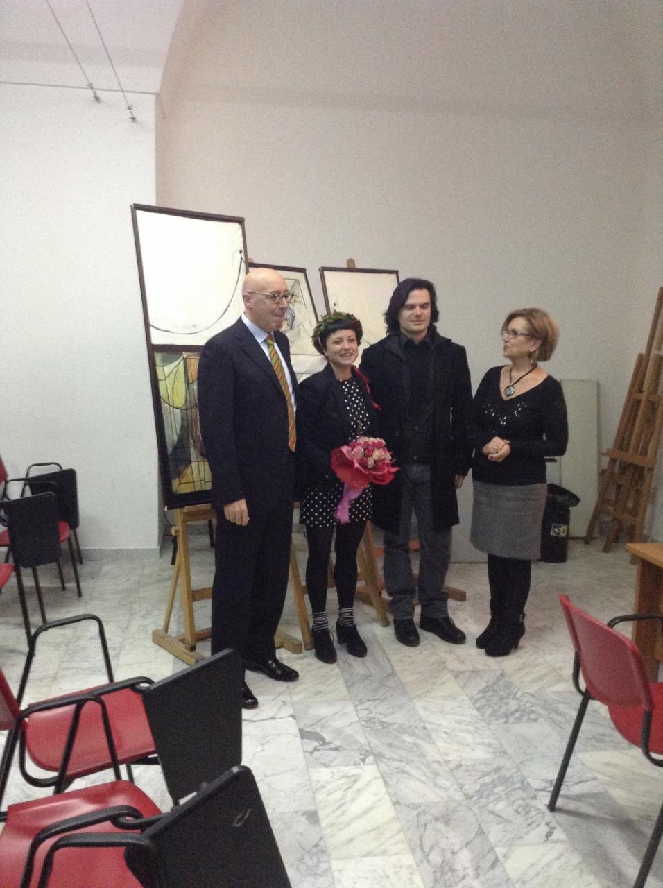 Alice Valente, discutendo la tesi dal titolo 'La realtà dell'arte astratta Mondrian e le icone bizantine: la ricerca della verità' (relatore il prof. Tommaso Ariemma) si è brillantemente laureata in pittura, presso l'Accademia delle Belle Arti di Lecce. Il 27 febbraio scorso, la giovane artista galatinese ha meritato il massimo dei voti e la lode. Ad assistere alla proclamazione della neo-dottoressa, oltre agli emozionatissimi genitori (Maria e Massimo) c'era anche il novantaquattrenne nonno Gaetano Valente.