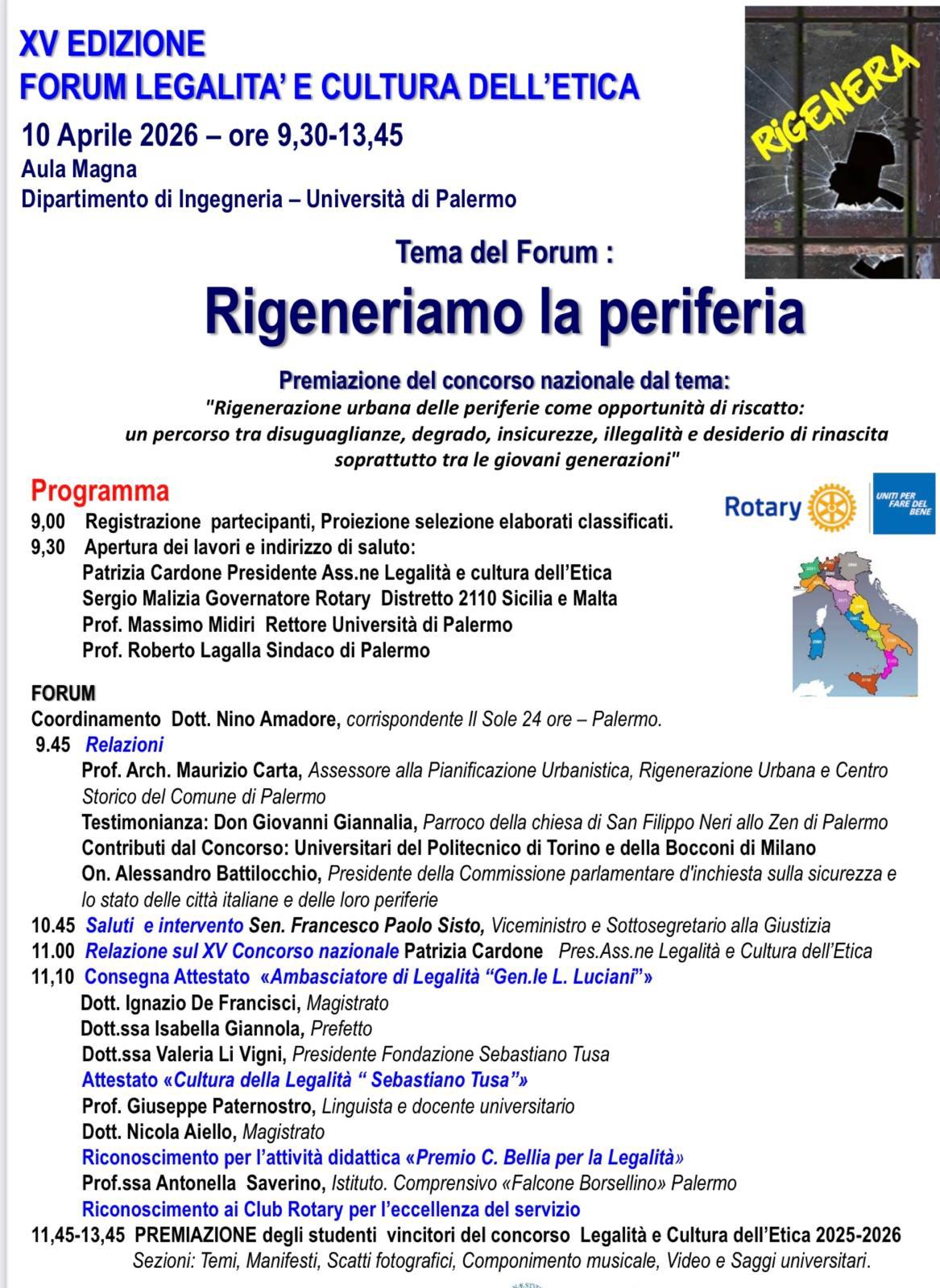 Giunto alla sua XV edizione, il forum — quest’anno dedicato al tema “Rigeneriamo la periferia” — è promosso dall’Associazione “Legalità e Cultura dell’Etica” in collaborazione con i distretti italiani del Rotary International.