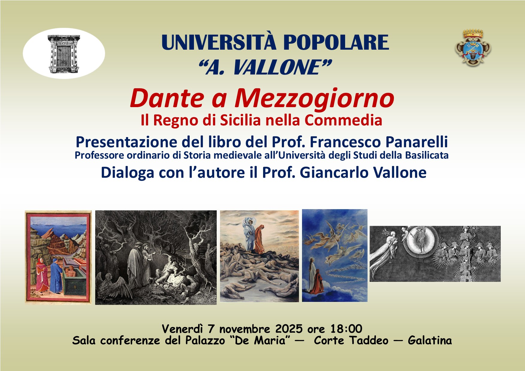 Oggi venerdì 7 novembre 2025 alle ore 18:00, nella Sala conferenze dell’ex Palazzo De Maria, in Corte Taddeo, l’Università Popolare “Aldo Vallone” propone la presentazione dell’ultimo lavoro del prof. Francesco Panarelli, un agile saggio, edito da Carocci editore nel 2024, dal titolo “Dante a Mezzogiorno. Il Regno di Sicilia nella Commedia”. Dialogherà con l’autore il nostro Socio onorario prof. Giancarlo Vallone. Francesco Panarelli, professore ordinario di Storia Medievale all’Università della Basilicata ed attualmente Presidente della Società italiana per la Storia Medievale, e il suo interlocutore, Giancarlo Vallone, professore emerito di Storia delle istituzioni politiche dell’Università del Salento, nella loro specifica veste accademica lasciano intendere che il focus dell’incontro odierno sarà di natura storica. Il filo conduttore del libro di Francesco Panarelli è stato infatti quello di aver voluto riprendere la Commedia e le altre opere di Dante e recuperare i passi in cui compaiono il Mezzogiorno e soprattutto le dinastie che lo governarono, i Normanni, gli Svevi, gli Angioini e gli Aragonesi, “per seguire il dipanarsi e le ragioni del rapporto di Dante con il Meridione d’Italia, con i due Regni che lo occupavano e soprattutto con le dinastie che governarono quei Regni. Il giudizio di Dante si espresse a chiare lettere in celebri terzine, che hanno contribuito a forgiare la secolare valutazione negativa sull’età angioina e sulle sue nefaste conseguenze per il destino del Mezzogiorno italiano e allo stesso tempo a rafforzare l’opinione positiva sui predecessori normanni.” Francesco Panarelli è membro dei comitati scientifici di numerose riviste; membro del Consiglio scientifico del ICHT (International Commission for the History of Towns), del CESIME (Centro studi sulla Storia degli insediamenti monastici europei) presso l’Università Cattolica di Milano, del “Forschungsstelle für Vergleichende Ordensgeschichte” presso la Technische Universität di Dresda, nonché membro del Direttivo della SISMED (Società Italiana degli Storici Medievisti) e socio deputato della Società di Storia Patria per la Lucania. Ha pubblicato oltre centosettanta lavori tra monografie, articoli e recensioni, occupandosi prevalentemente di storia del Mezzogiorno italiano in età medievale, con una particolare attenzione per l’età normanna e sveva; di storia delle città del Mezzogiorno e delle istituzioni ecclesiastiche; di storia del monachesimo; di problemi legati all’insediamento rupestre; non mancano pubblicazioni dedicate al mondo della scuola e della divulgazione.