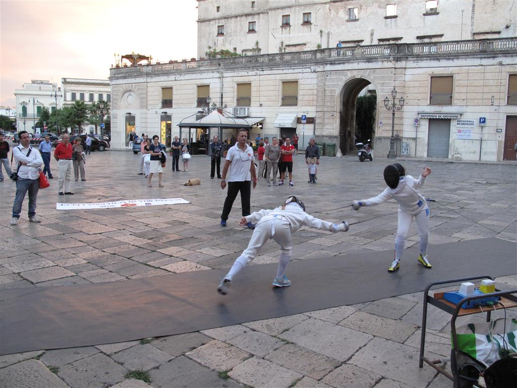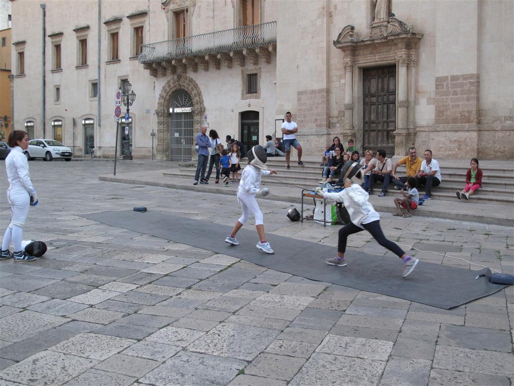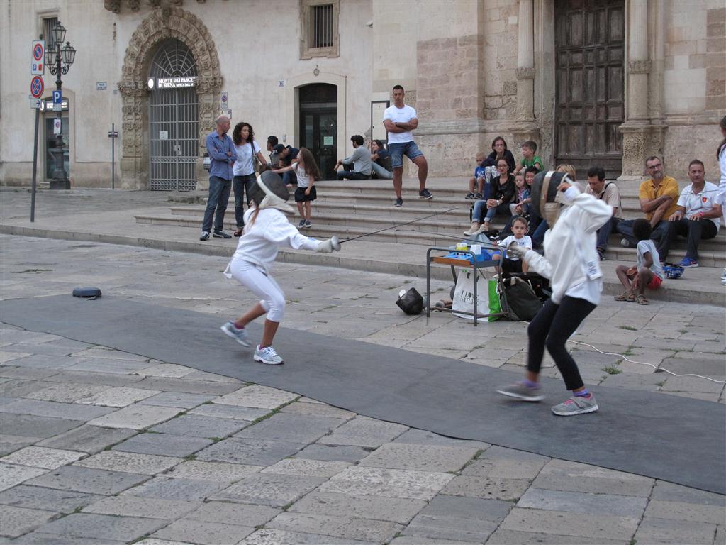 Galatina - Su un tappeto rosso al centro di Piazza San Pietro due giovani in completo bianco e maschera protettrice incrociano con eleganza le spade. Ogni tanto un beep segnala che una stoccata è andata a segno. Un'altra ragazza a viso scoperto e con lunghi capelli castani arbitra l'incontro. Passano le giovani fiorettiste e la scena si ripete. Intorno non ci sono molte persone ma tutte applaudono quando il colpo va a segno.