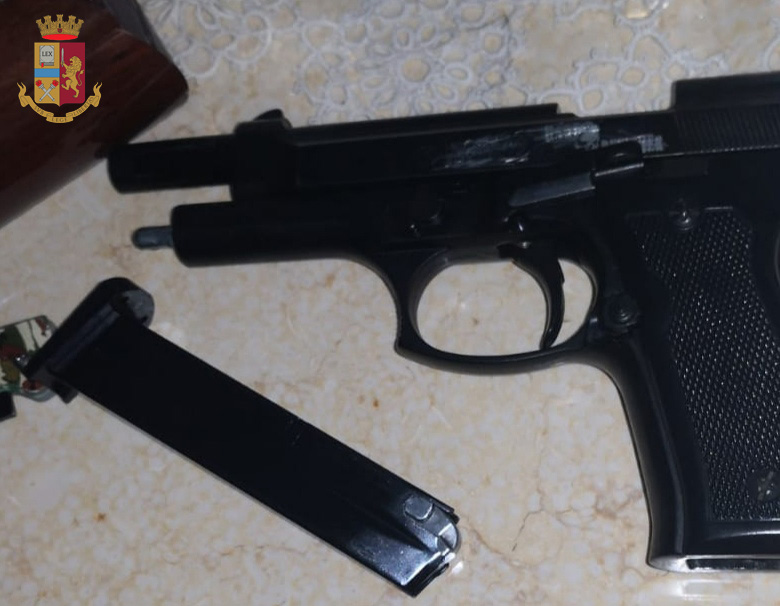 L’attività di perquisizione nei suoi confronti, estesa all’auto a lui in uso e all’abitazione, ha consentito di rinvenire, nella sua camera da letto, conservati in un armadio, un pugnale con relativo fodero, della lunghezza complessiva di 38 cm ed una baionetta marca “Waffenfabrik Neuhausen”, completa di fodero in metallo, lunga complessivamente circa 45 cm; mentre nel cassetto di un comò è stata rinvenuta una “scacciacani” di colore nero, marca Kimar, modello 92 Auto, replica della pistola Beretta modello 92 in uso alle forze di Polizia.