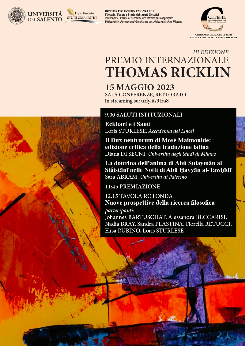 Per l’edizione critica del secondo libro del “Dux neutrorum” (Guida dei perplessi) di Mosé Maimonide, la ricercatrice Diana Di Segni dell’Università di Milano La Statale ha vinto l’edizione 2023 del Premio internazionale “Thomas Ricklin”, coordinato dal Centro interateneo CETEFIL - Centro per l’edizione di testi filosofici medievali e rinascimentali. La cerimonia di consegna del premio è in programma lunedì 15 maggio 2023 alle ore 9 nella sala conferenze del Rettorato dell’Università del Salento (piazza Tancredi 7, Lecce); in quest’occasione il professor Loris Sturlese, accademico dei Lincei, terrà una lectio magistralis su “Eckhart e i Santi” e si svolgerà una tavola rotonda sul tema “Nuove prospettive della ricerca filosofica” con i/le docenti Sandra Plastina Ricklin, Loris Sturlese, Johannes Bartuschat, Alessandra Beccarisi, Fiorella Retucci, Elisa Rubino e Nadia Bray. I lavori potranno essere seguiti anche online su urly.it/3tra8. Thomas Ricklin, di origini svizzere e docente alla Ludwig Maximilian Universität di Monaco, è stato un noto studioso della cultura filosofica medievale, con particolare attenzione alla poesia e alle opere filosofiche di Dante Alighieri. La sua traduzione con commento del Convivio (per la casa editrice Meiner di Amburgo) è considerata una svolta importante negli studi di filosofia dantesca, e ha contribuito alla ricezione in Francia e in Germania della filosofia di Dante. Insignito della Medaglia d’argento come traduttore di Dante dalla Società dantesca di Firenze, Ricklin è scomparso nel 2016 lasciando studi sulla Fisica di Aristotele, sull’anonimo Libro delle Cause e sulle teorie dei sogni (Il sogno della filosofia nel XII secolo). Il premio istituito in sua memoria dalla famiglia Ricklin e dalla moglie Sandra Plastina Ricklin, docente di Storia della filosofia all’Università della Calabria, ha lo scopo, ogni anno, di sostenere la pubblicazione di uno studio critico o l’edizione di un testo nell’ambito della filosofia medievale e rinascimentale. Diana Di Segni è ricercatrice in Storia della filosofia medievale all’Università degli Studi di Milano La Statale. Precedentemente è stata ricercatrice al Thomas-Institut dell’Università di Colonia, dove si è occupata dell’edizione critica della traduzione latina della “Guida dei perplessi” di Mosè Maimonide. Tra i suoi ambiti di ricerca, la ricezione del pensiero ebraico medievale in ambito latino, le traduzioni filosofiche e scientifiche da e verso il latino, la polemica religiosa nel Medioevo Il Centro per l’edizione di testi filosofici medievali e rinascimentali CETEFIL è Centro interateneo con sedi presso l’Università di Foggia, l’Università del Salento, l’Università di Trento e l’Università di Napoli ‘L’Orientale’. Diretto dalla professoressa Alessandra Beccarisi dell’Università di Foggia, il Centro svolge attività di raccolta bibliografica, organizza incontri, seminari e conferenze, è punto di raccordo tra studiosi, istituzioni accademiche, case editrici ed enti, assiste e promuove ricerche e progetti editoriali specifici con particolare attenzione ai/lle giovani studiosi/e. Del comitato direttivo fanno parte anche le docenti UniSalento Fiorella Retucci, Elisa Rubino e Nadia Bray.
