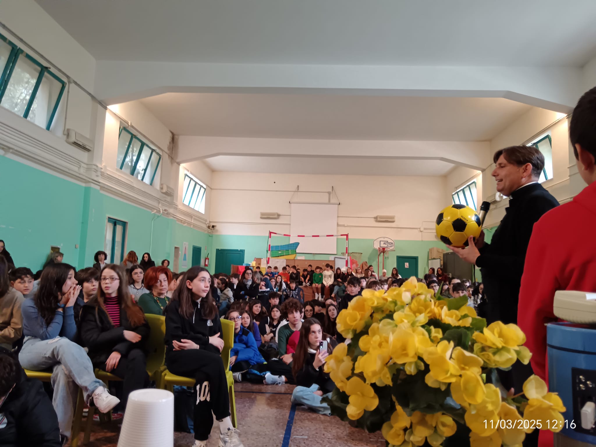 Il suo intervento è stato sorprendente e incisivo, ha colto di sorpresa i ragazzi, riuscendo a colpire nel segno. Don Antonio ha parlato con passione del valore della vita e dell’importanza di scegliere la strada dell’amore, del rispetto e della legalità, evitando il fascino delle scorciatoie che portano alla criminalità. L’intervento di Don Antonio si è distinto per il suo consueto approccio concreto e diretto, proponendo agli studenti non un discorso teorico, ma portandoli a riflettere sulla necessità di costruire un futuro migliore, lontano da dipendenze e comportamenti illegali. Il prete ha parlato della sua vocazione e del suo impegno quotidiano nei quartieri periferici di Roma non con retorica, ma facendo esempi concreti e reali e trasmettendo un messaggio chiaro e motivante: il vero valore risiede nell’amare la vita in tutte le sue sfumature, affrontando le difficoltà con coraggio.