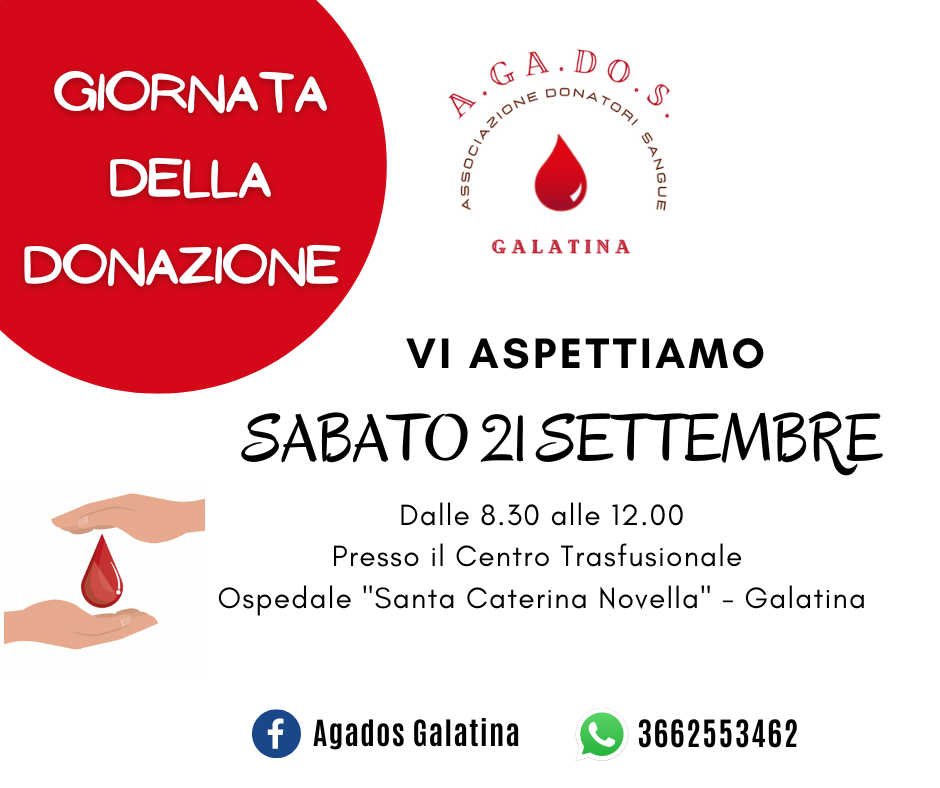 A.GA.DO.S., Associazione Galatinese Donatori Sangue, comunica che la prossima Giornata della donazione si terrà Sabato 21 Settembre 2024 presso il Centro trasfusionale dell'ospedale “Santa Caterina Novella” di Galatina, dalle ore 8:30 alle ore 12:00. In occasione di questa giornata, tutti i donatori parteciperanno all'estrazione di un buono per una torta pasticciotto da ritirare presso "Gran Caffè" a Galatina. L'Associazione si augura che l’invito possa essere accolto da molti, soci e non, affinché si possa contribuire tutti insieme, ognuno con il suo piccolo grande gesto, alla raccolta di sangue. Ricordate sempre il nostro motto: “Una goccia di vita per la vita!"