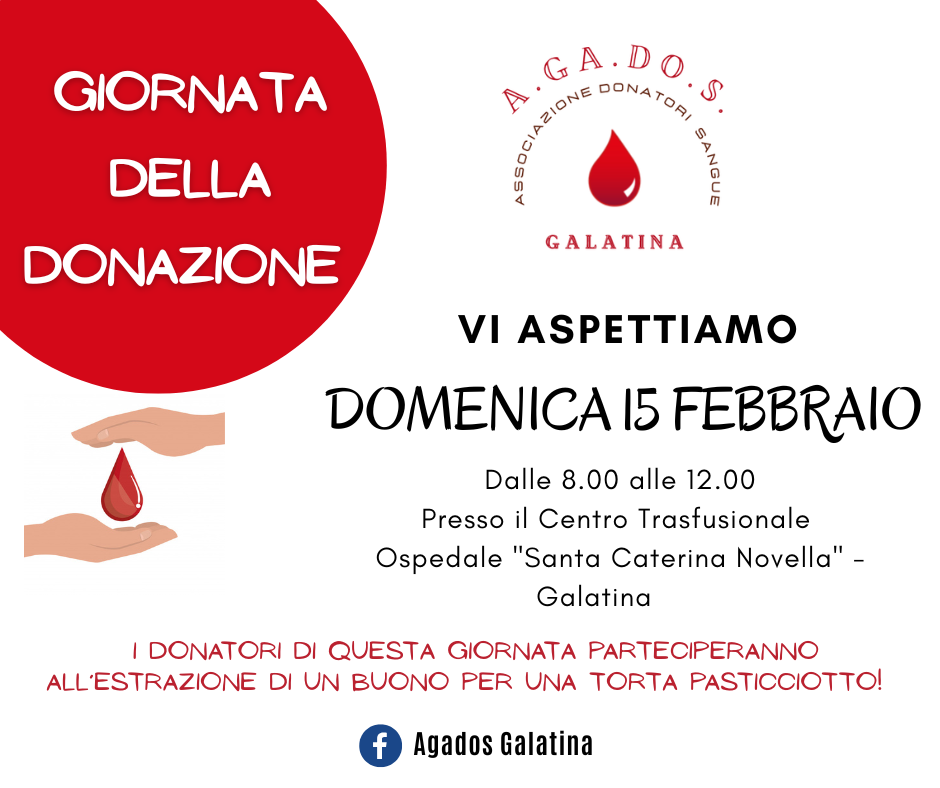 A.GA.DO.S., Associazione Galatinese Donatori Sangue, comunica che la prossima Giornata della donazione si terrà Domenica 15 febbraio 2026 presso il Centro trasfusionale dell'ospedale “Santa Caterina Novella” di Galatina, dalle ore 8:00 alle ore 12:00.