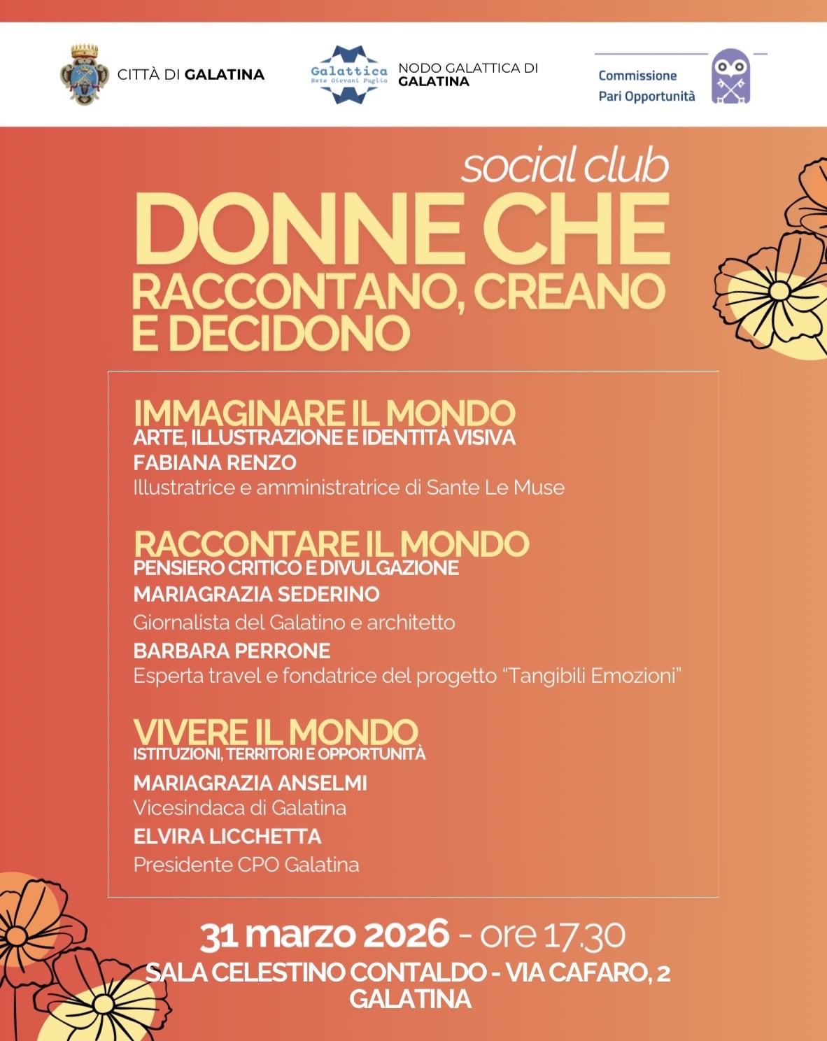 L’incontro si articolerà attraverso tre percorsi tematici, guidati da professioniste del territorio che condivideranno le proprie esperienze di visione, narrazione e impegno civico. A dare voce alla creatività sarà Fabiana Renzo, illustratrice e amministratrice di Sante Le Muse, che approfondirà il potere delle immagini nel dare forma all’identità visiva contemporanea. Dall'immagine si passerà alla parola con la sezione "Raccontare il Mondo", focalizzata sul pensiero critico e sulla divulgazione. Il dibattito vedrà l'intreccio di due esperienze professionali di rilievo: quella di Mariagrazia Sederino, che unisce la sensibilità dell'architetto alla precisione della giornalista del Galatino, e quella di Barbara Perrone, esperta di travel e fondatrice del progetto “Tangibili Emozioni”, volto a narrare il viaggio come esperienza profonda di scoperta. L'evento si concluderà con gli interventi di Mariagrazia Anselmi, Vicesindaca di Galatina, e di Elvira Licchetta, Presidente della Commissione Pari Opportunità di Galatina, che offriranno una sintesi preziosa tra visione politica, ruoli istituzionali e tutele sociali. La cittadinanza è invitata a partecipare. Il prossimo 31 marzo 2026, alle ore 17:30, la Sala Celestino Contaldo di Galatina ospiterà il social club "Donne che raccontano, creano e decidono". L’iniziativa, promossa dalla Nodo Galattica di Galatina, in collaborazione con il Comune di Galatina e la Commissione Pari Opportunità, nasce come momento di confronto e riflessione sul ruolo delle donne nell’arte, nella divulgazione e nelle istituzioni. L’incontro si articolerà attraverso tre percorsi tematici, guidati da professioniste del territorio che condivideranno le proprie esperienze di visione, narrazione e impegno civico. A dare voce alla creatività sarà Fabiana Renzo, illustratrice e amministratrice di Sante Le Muse, che approfondirà il potere delle immagini nel dare forma all’identità visiva contemporanea. Dall'immagine si passerà alla parola con la sezione "Raccontare il Mondo", focalizzata sul pensiero critico e sulla divulgazione. Il dibattito vedrà l'intreccio di due esperienze professionali di rilievo: quella di Mariagrazia Sederino, che unisce la sensibilità dell'architetto alla precisione della giornalista del Galatino, e quella di Barbara Perrone, esperta di travel e fondatrice del progetto “Tangibili Emozioni”, volto a narrare il viaggio come esperienza profonda di scoperta. L'evento si concluderà con gli interventi di Mariagrazia Anselmi, Vicesindaca di Galatina, e di Elvira Licchetta, Presidente della Commissione Pari Opportunità di Galatina, che offriranno una sintesi preziosa tra visione politica, ruoli istituzionali e tutele sociali. La cittadinanza è invitata a partecipare. Il prossimo 31 marzo 2026, alle ore 17:30, la Sala Celestino Contaldo di Galatina ospiterà il social club "Donne che raccontano, creano e decidono". L’iniziativa, promossa dalla Nodo Galattica di Galatina, in collaborazione con il Comune di Galatina e la Commissione Pari Opportunità, nasce come momento di confronto e riflessione sul ruolo delle donne nell’arte, nella divulgazione e nelle istituzioni. L’incontro si articolerà attraverso tre percorsi tematici, guidati da professioniste del territorio che condivideranno le proprie esperienze di visione, narrazione e impegno civico. A dare voce alla creatività sarà Fabiana Renzo, illustratrice e amministratrice di Sante Le Muse, che approfondirà il potere delle immagini nel dare forma all’identità visiva contemporanea. Dall'immagine si passerà alla parola con la sezione "Raccontare il Mondo", focalizzata sul pensiero critico e sulla divulgazione. Il dibattito vedrà l'intreccio di due esperienze professionali di rilievo: quella di Mariagrazia Sederino, che unisce la sensibilità dell'architetto alla precisione della giornalista del Galatino, e quella di Barbara Perrone, esperta di travel e fondatrice del progetto “Tangibili Emozioni”, volto a narrare il viaggio come esperienza profonda di scoperta. L'evento si concluderà con gli interventi di Mariagrazia Anselmi, Vicesindaca di Galatina, e di Elvira Licchetta, Presidente della Commissione Pari Opportunità di Galatina, che offriranno una sintesi preziosa tra visione politica, ruoli istituzionali e tutele sociali. La cittadinanza è invitata a partecipare. Il prossimo 31 marzo 2026, alle ore 17:30, la Sala Celestino Contaldo di Galatina ospiterà il social club "Donne che raccontano, creano e decidono". L’iniziativa, promossa dalla Nodo Galattica di Galatina, in collaborazione con il Comune di Galatina e la Commissione Pari Opportunità, nasce come momento di confronto e riflessione sul ruolo delle donne nell’arte, nella divulgazione e nelle istituzioni. L’incontro si articolerà attraverso tre percorsi tematici, guidati da professioniste del territorio che condivideranno le proprie esperienze di visione, narrazione e impegno civico. A dare voce alla creatività sarà Fabiana Renzo, illustratrice e amministratrice di Sante Le Muse, che approfondirà il potere delle immagini nel dare forma all’identità visiva contemporanea. Dall'immagine si passerà alla parola con la sezione "Raccontare il Mondo", focalizzata sul pensiero critico e sulla divulgazione. Il dibattito vedrà l'intreccio di due esperienze professionali di rilievo: quella di Mariagrazia Sederino, che unisce la sensibilità dell'architetto alla precisione della giornalista del Galatino, e quella di Barbara Perrone, esperta di travel e fondatrice del progetto “Tangibili Emozioni”, volto a narrare il viaggio come esperienza profonda di scoperta. L'evento si concluderà con gli interventi di Mariagrazia Anselmi, Vicesindaca di Galatina, e di Elvira Licchetta, Presidente della Commissione Pari Opportunità di Galatina, che offriranno una sintesi preziosa tra visione politica, ruoli istituzionali e tutele sociali. La cittadinanza è invitata a partecipare. Il prossimo 31