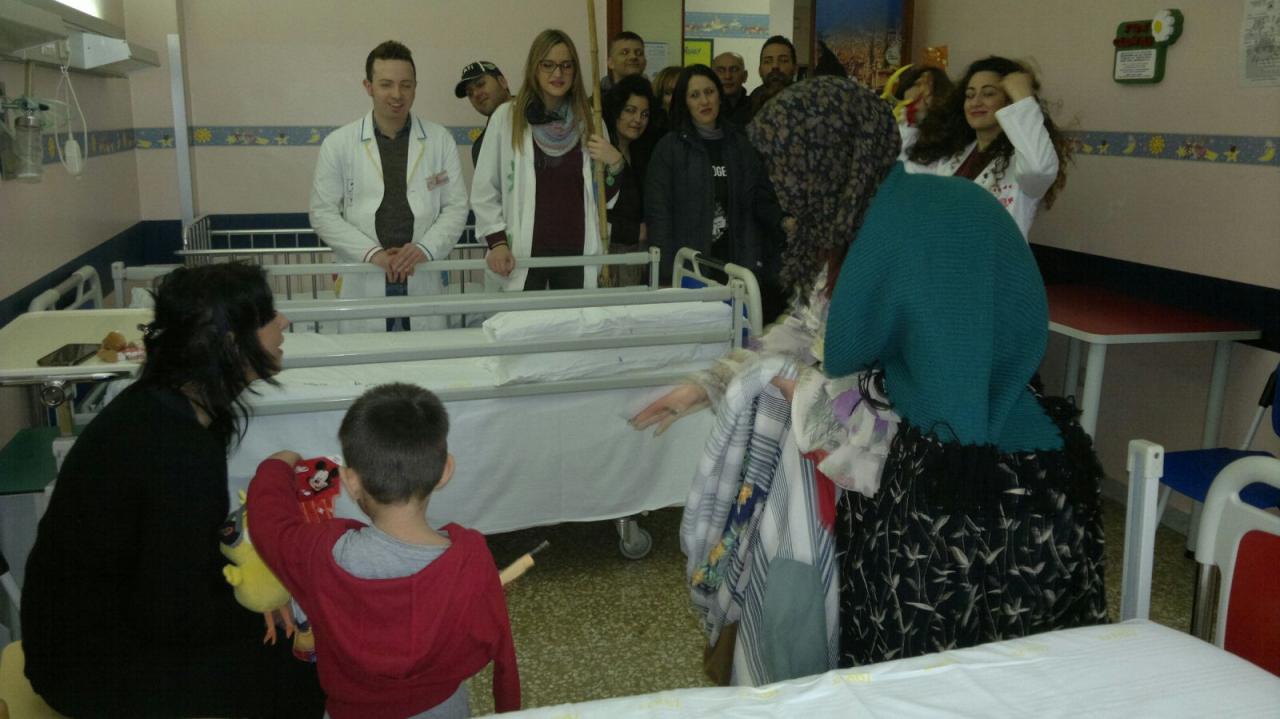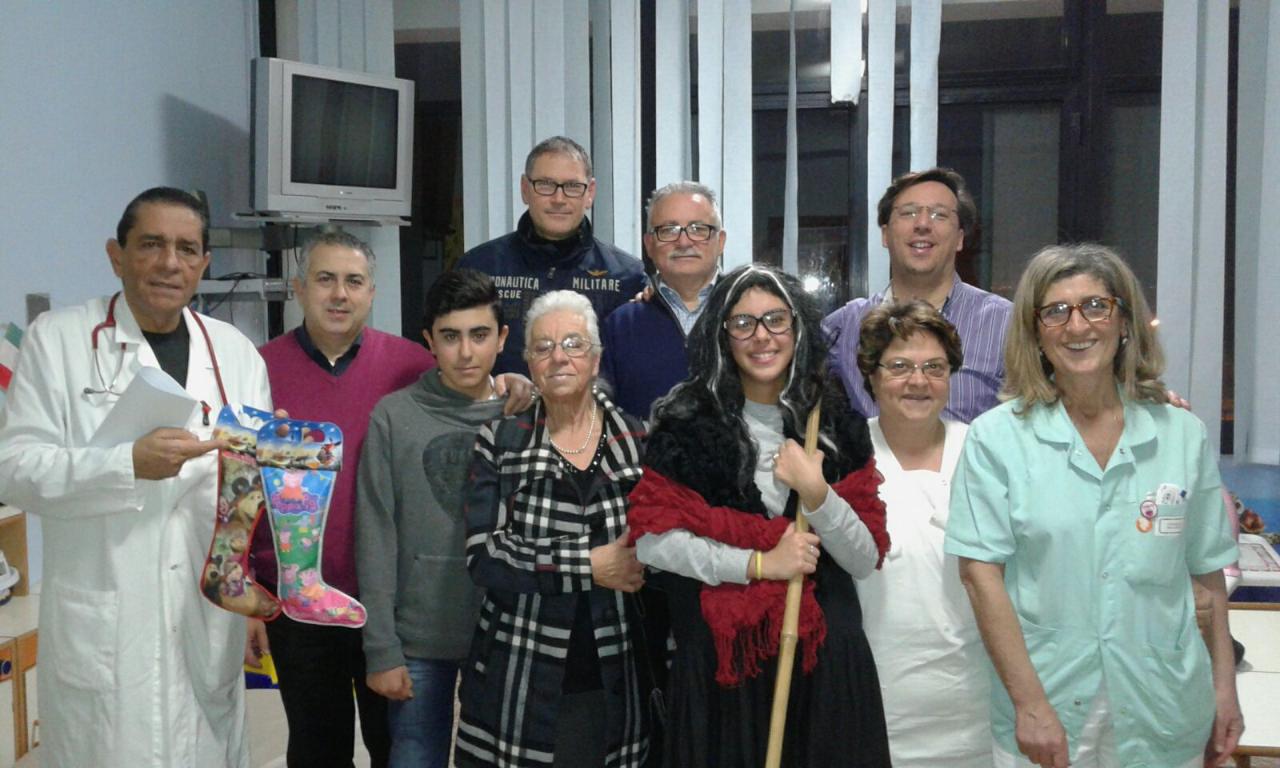 Erminia, la Befana azzurra, era già andata in reparto il 24 dicembre scorso per accompagnare Nicola, Babbo Natale, ed aiutarlo a distribuire i doni della vigilia di Natale.