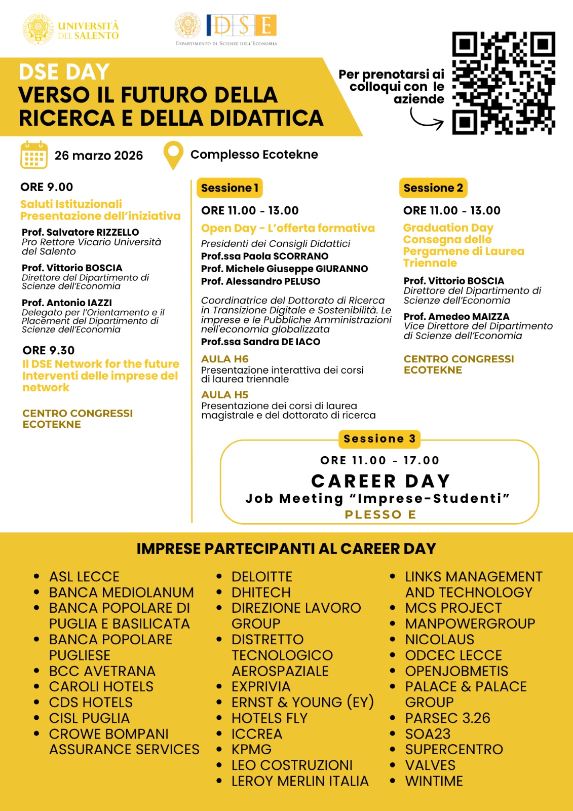 La nuova edizione del “DSE day”, organizzato dal Dipartimento di Scienze dell’Economia dell’Università del Salento per la giornata del 26 marzo 2026, rappresenta un momento di estrema importanza per gli studenti e per il territorio e le realtà imprenditoriali aderenti.