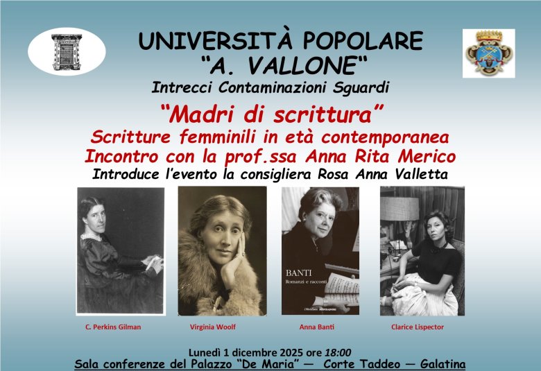Oggi lunedì 1 dicembre 2025 alle ore 18:00, nella Sala conferenze dell’ex Palazzo De Maria, in Corte Taddeo, l’Università Popolare “Aldo Vallone” propone una conferenza della pr