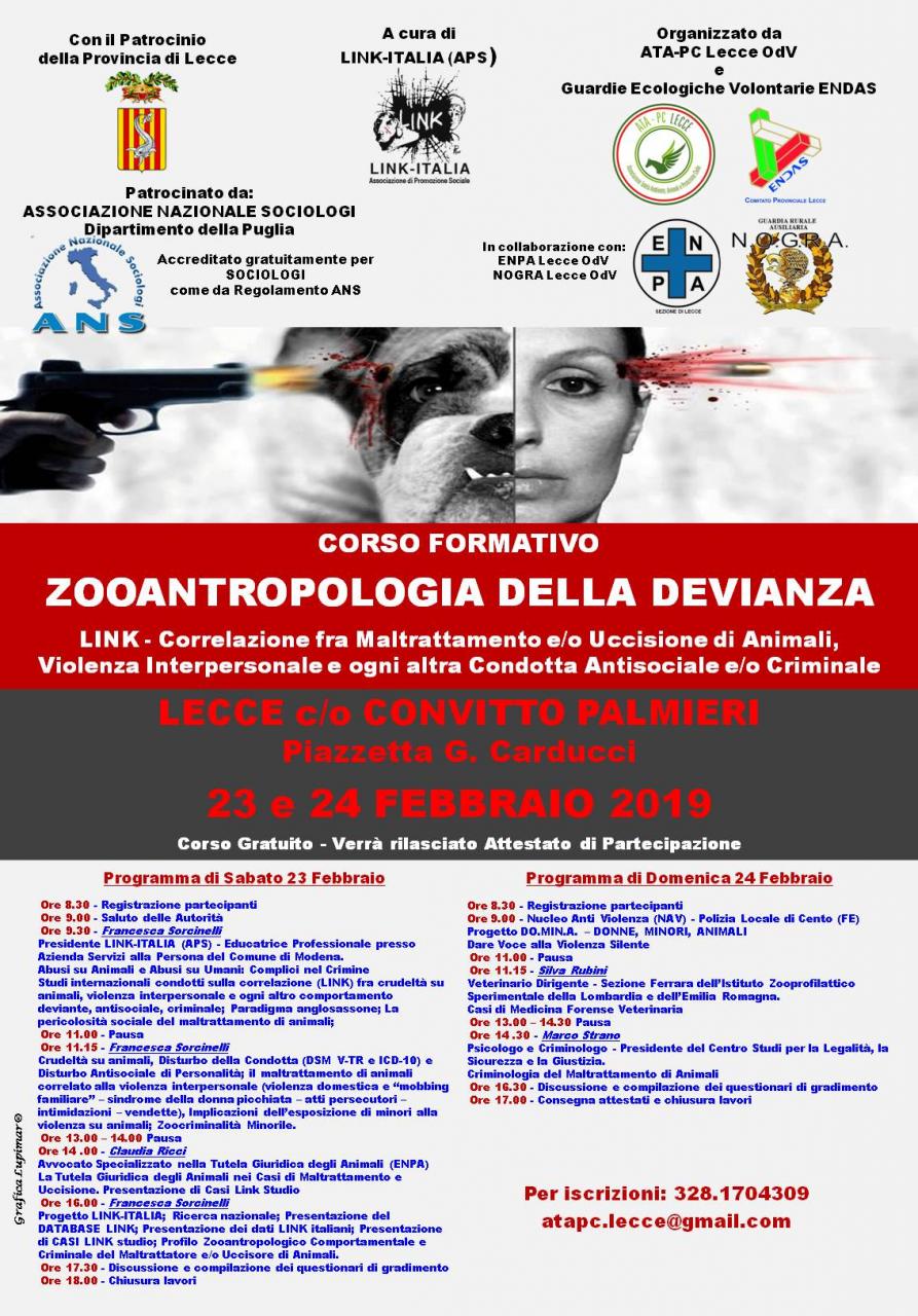 Esiste una correlazione tra il maltrattamento degli animali e la pericolosità sociale. A metterlo in luce sarà il corso formativo che si terrà sabato 23 e domenica 24 febbraio a Lecce presso il Convitto Palmieri. L’iniziativa formativa “Zooantropologia della Devianza - Correlazione fra maltrattamento e uccisione di animali, violenza interpersonale e ogni altra condotta antisociale e criminale”, fornirà dati ed esempi di recenti studi che associano la tendenza a uno specifico reato in base al rapporto che nel corso della vita si è avuto con gli animali. È emerso, infatti, in seguito a uno studio condotto da Link-Italia su un campione di oltre 500 detenuti, che il 61% ha maltrattato o ucciso animali da minorenne; di questi, tra i detenuti per omicidio, il 69% ha ucciso animali da adulto, mentre tra i carcerati per reati a sfondo sessuale il 71% ha commesso lo stesso reato. Il corso, aperto a tutta la cittadinanza, è destinato soprattutto a veterinari, sociologi, psichiatri ed educatori, ma anche assistenti sociali, criminologi, pediatri e infermieri.