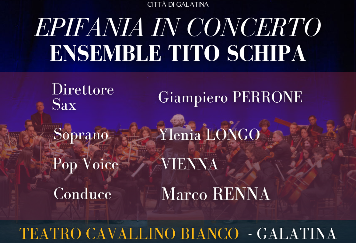 Venerdì 5 gennaio 2024 alle ore 20 il Teatro Cavallino Bianco ospiterà il “Concerto augurale per il 2024” con cui il Sindaco e l’Amministrazione Comunale di Galatina "sono felici di brindare al nuovo anno".