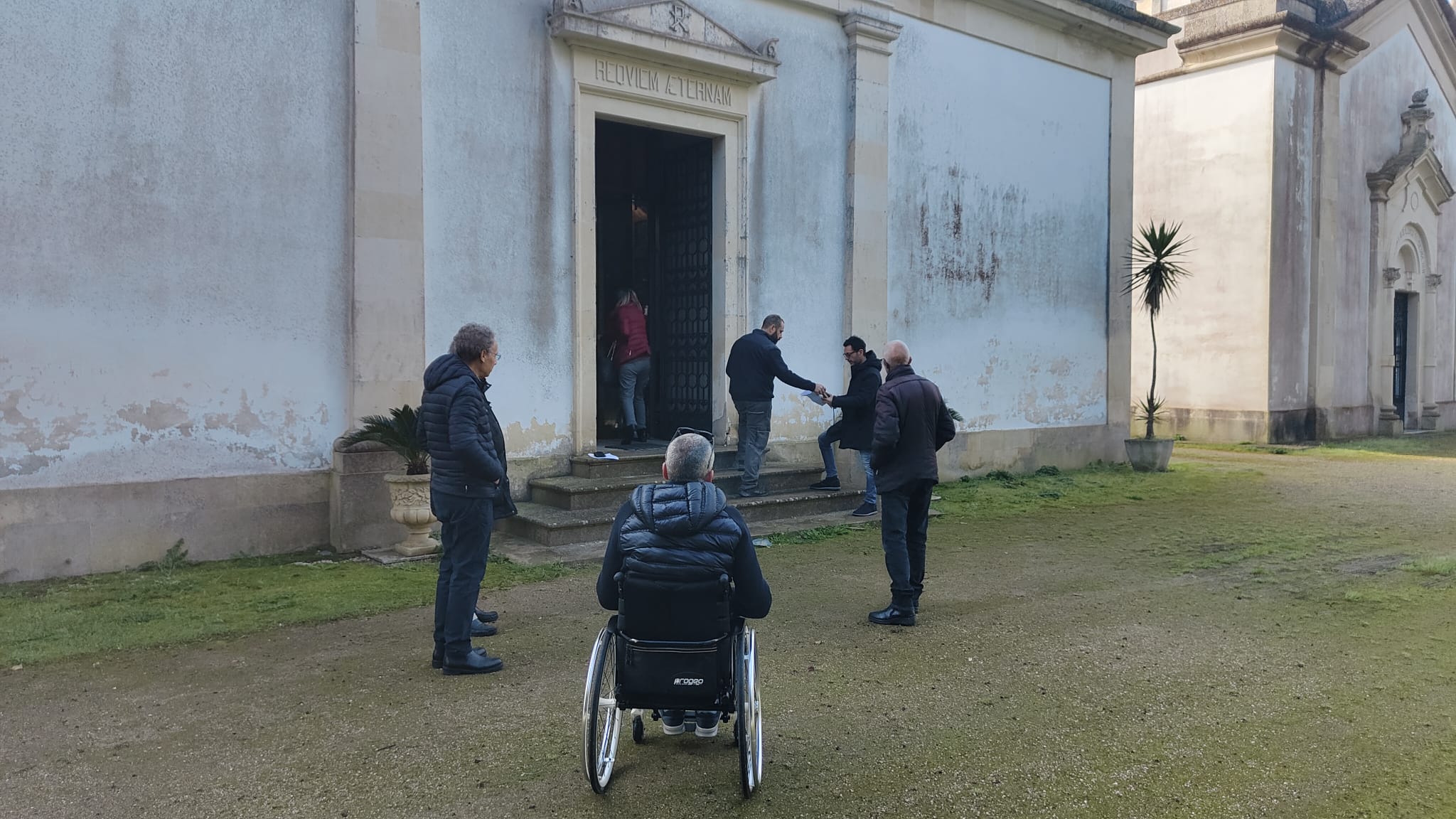 Qualcosa si è smosso e la rampa, che gli permetterà di muoversi in autonomia per pregare davanti alla tomba della mamma, diventerà realtà. Lo ha detto a chiare lettere il priore dell’Arciconfraternita dell’Immacolata, Adolfo Notaro, che ieri mattina si è riunito al cimitero con Fernando, altri confratelli e l’ingegnere Cosimo De Giorgi. Il tecnico ha preso le misure e, con il progetto già ideato su carta, ha stabilito modalità e tempistiche per la realizzazione di uno scivolo all’ingresso.