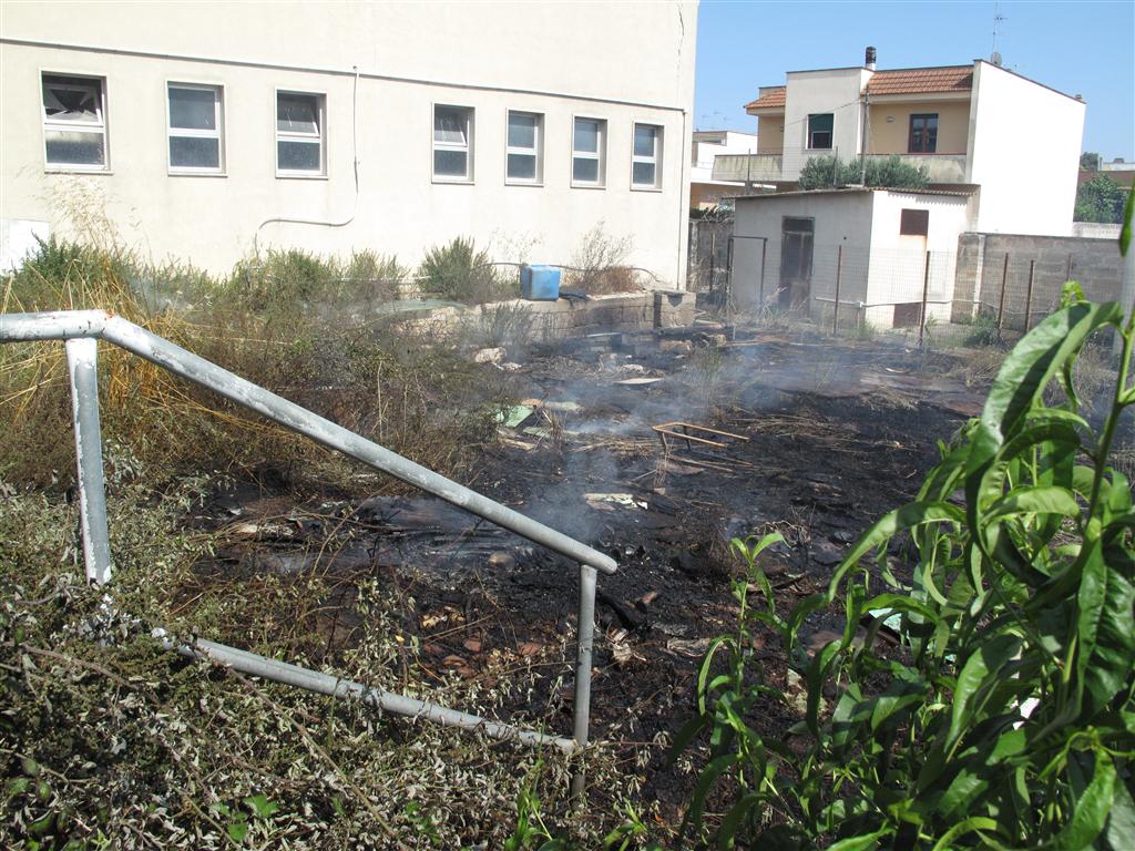 Il fuoco, intanto, alimentato dal venticello di ponente, si è diretto verso via Martiri d’Otranto. Qui ha trovato facile esca nelle erbe secche e in cinque pneumatici abbandonati proprio sotto il muro di confine dell’Istituto professionale. Purtroppo anche all’interno della scuola le erbacce erano alte e secche e sono andate a fuoco minacciando l’edificio. È stata Rosanna Lagna, dirigente dell’IISS “Falcone e Borsellino” a far avvertire, intorno alle ore 15, i Vigili del Fuoco che hanno spento l’incendio.