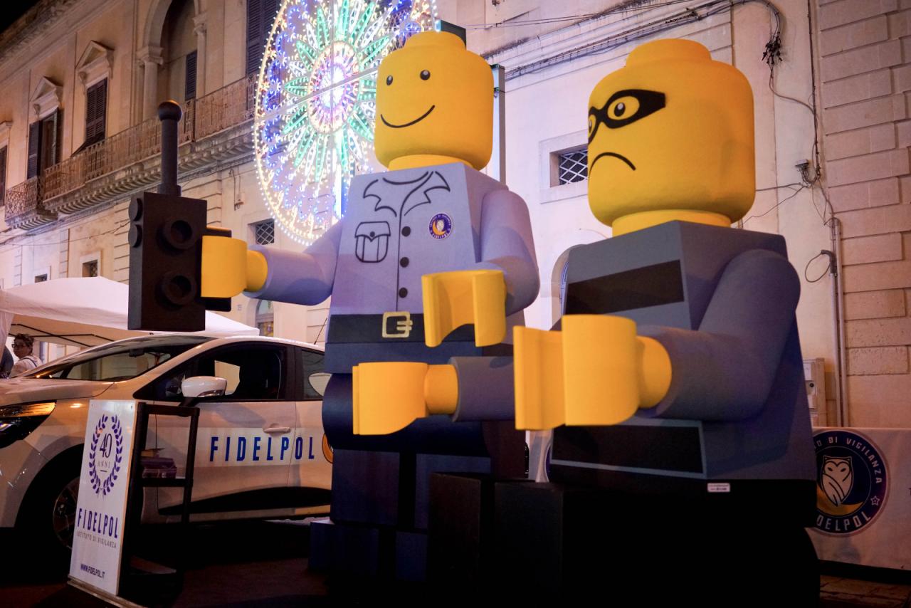 Rivive l’antico gioco di guardie e ladri nell’originale installazione che Fidelpol ha voluto fare per festeggiare i suoi 40 anni di attività. Due Lego di tre metri in polistirene, un poliziotto e un malvivente, per inquadrare in una sola scena ironica, ma veritiera, l’operato dell’istituto di vigilanza galatinese.