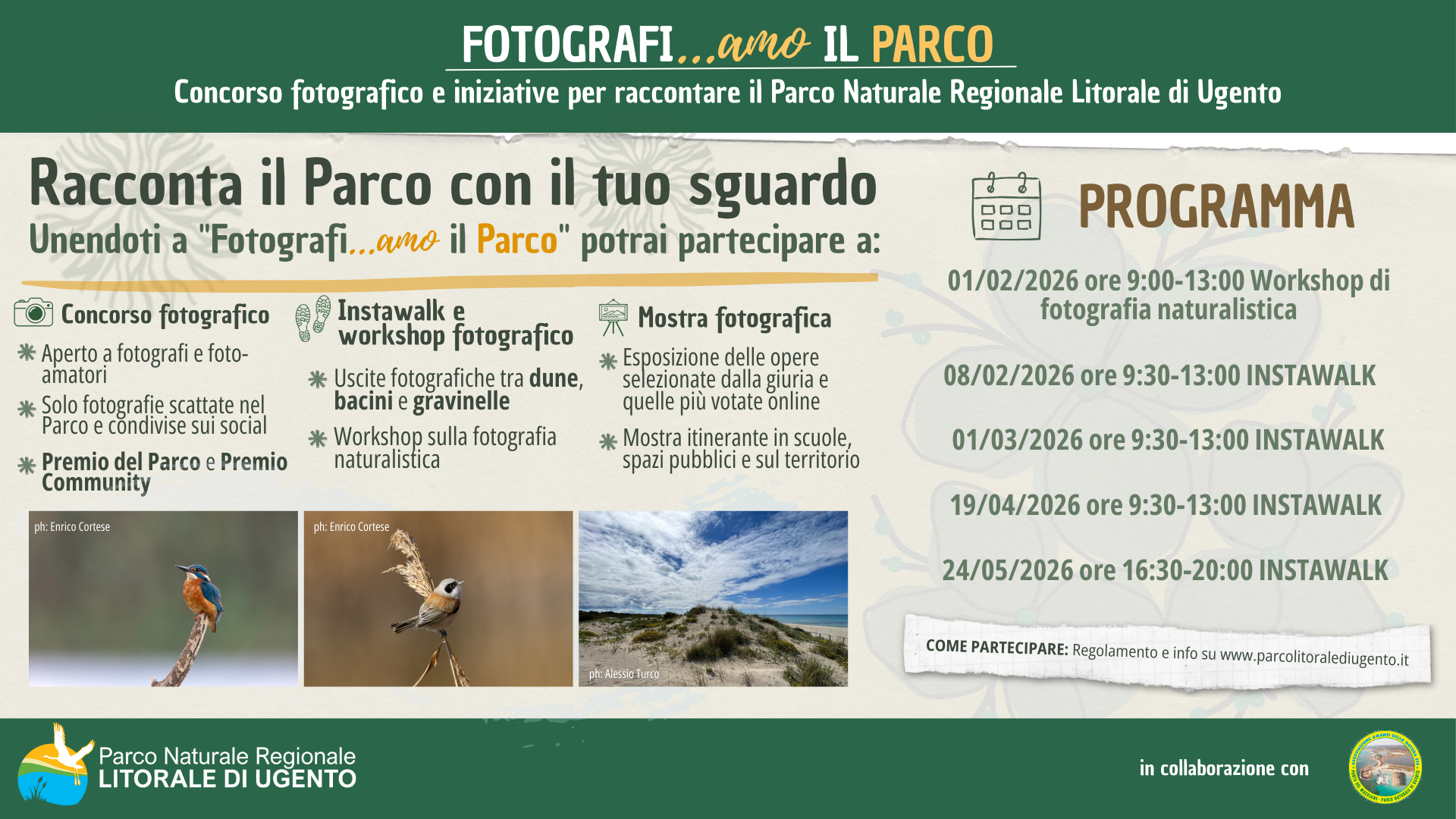 All’incontro sono intervenuti con i saluti istituzionali il Sindaco di Ugento, Salvatore Chiga, e il Direttore del Parco, Francesco de Franco, mentre la presentazione del programma è stata curata dall’Associazione Amanti della Natura – Punta del Macolone – Parco Naturale di Ugento. Il progetto è pensato per coinvolgere fotografi e fotoamatori, appassionati, famiglie, associazioni e scuole: la fotografia diventa uno strumento di partecipazione e consapevolezza, capace di mettere in luce la ricchezza ambientale del Parco e, al tempo stesso, rafforzare il senso di appartenenza della comunità a un bene comune. Il programma entra nel vivo a febbraio con il Workshop di fotografia naturalistica, in calendario domenica 1 febbraio 2026 (ore 9:00–13:00) presso il Centro Visite del Parco – SP 91 Ugento. È un appuntamento pensato per acquisire tecniche e strumenti utili a fotografare in modo corretto e rispettoso gli ambienti naturali, preparandosi alle uscite sul campo. Seguono gli instawalk, vere e proprie esperienze guidate nel Parco, ciascuna dedicata a un tema specifico.