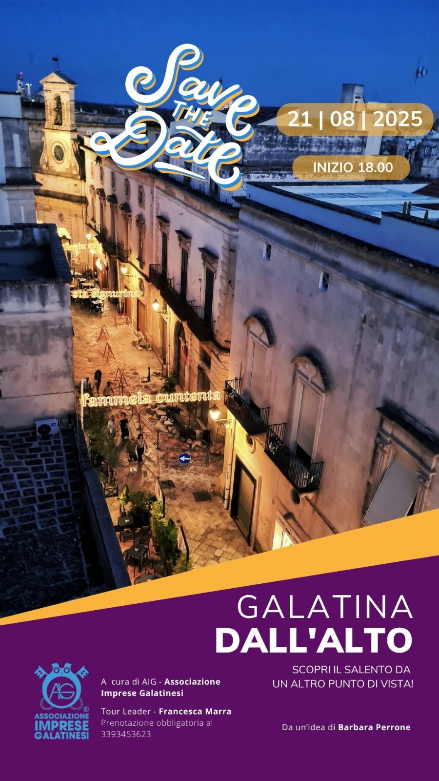 AIG- Associazione Imprese Galatinesi, da un' idea di Barbara Perrone e in collaborazione con Francesca Marra, presenta giovedì 21 Agosto 2025 e giovedì 28 Agosto alle ore 18:00 GALATINA DALL' ALTO: un tour esclusivo dall'alto di chiese, palazzi e terrazze per concedere ai visitatori uno sguardo d'eccezione su una città che mai finisce di sorprendere.