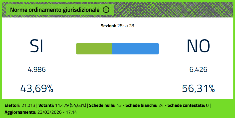 Anche a Galatina ha vinto il NO al Referendum sulla separazione delle carriere dei magistrati. Sono stati 6426 (56,31%) i galatinesi che hanno scelto di non modificare la Costituzione della Repubblica Italiana. Mentre ad esprimersi per il suo cambiamento sono stati 4986 (43,69%).